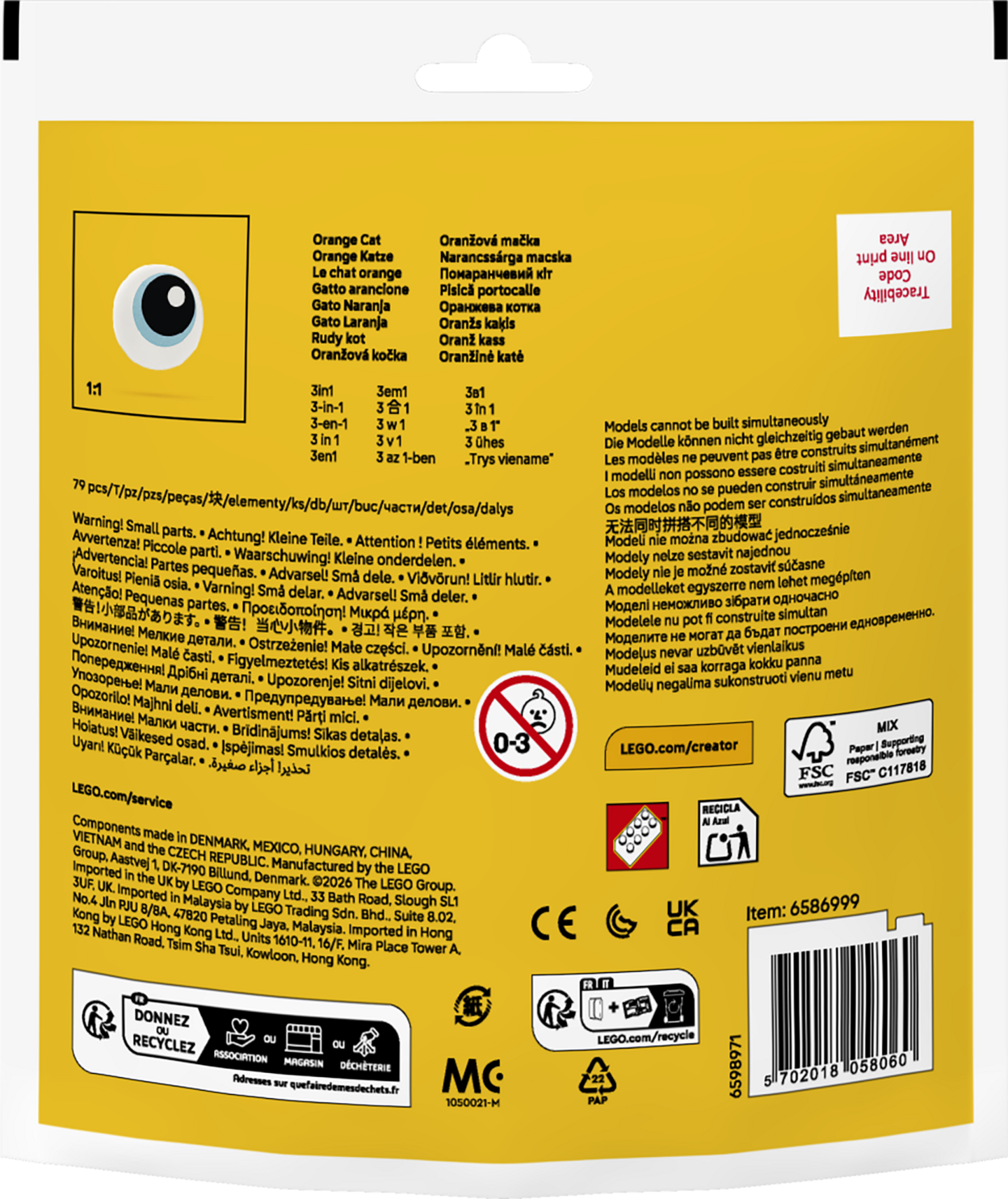 Tästä hurmaavasta 3 in 1 ‑setistä eläinten ystävät voivat rakentaa kissan maitokulhoineen. Saman setin osista voi loihtia myös krokotiilin ja vesilammikon tai kahta munaa pesässään suojelevan pöllön.