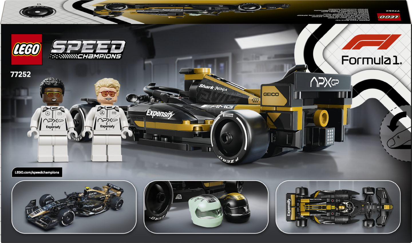 F1-leluautossa on elokuvassa esiintyvästä autosta tuttuja yksityiskohtia, kuten mustan ja kullan sävyissä komeileva ulkoasu, sponsoritarrat ja leveät takarenkaat, joihin on painettu teksti ”Pirelli”. Kilpa-autosetti sisältää myös kaksi F1-kuljettajan minihahmoa, Sonny Hayesin ja Joshua Pearcen. Kummallakin on nimikoitu kypärä, peruukki ja jakoavain, jota voidaan käyttää myös tarrojen kiinnittämiseen ja palikoiden irrottamiseen.