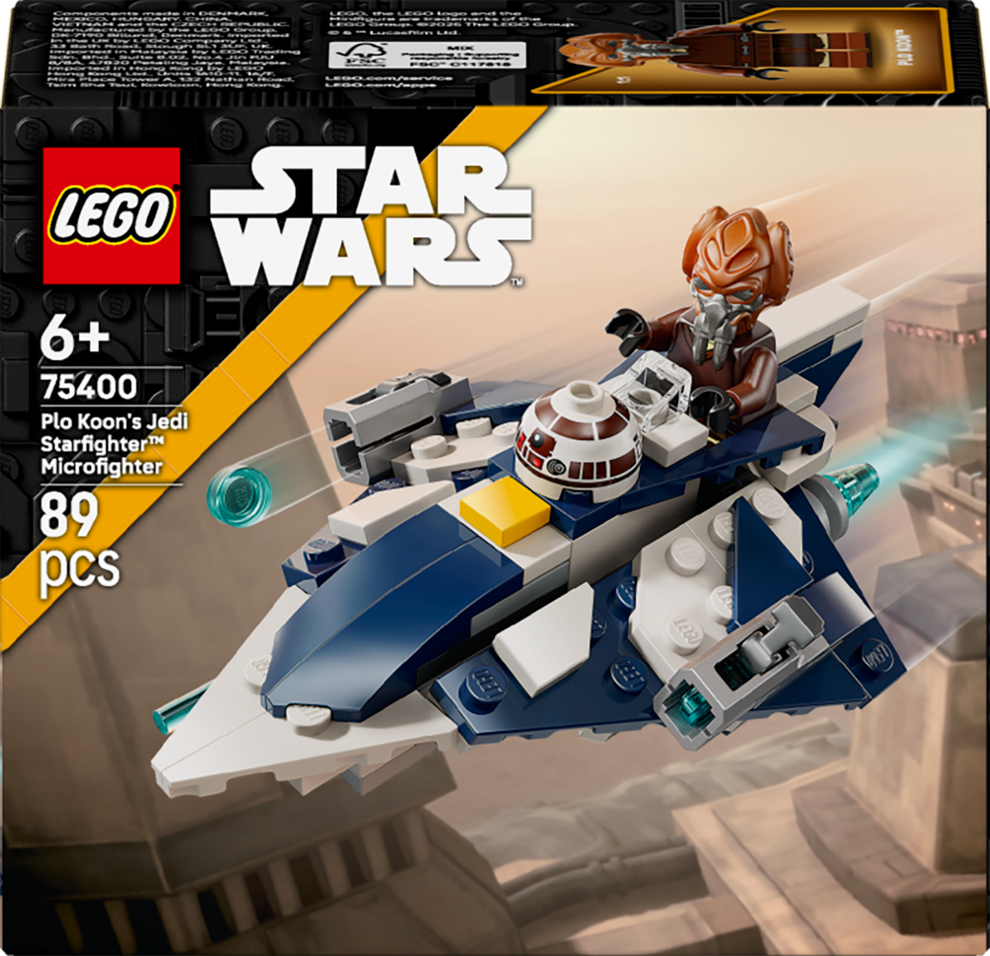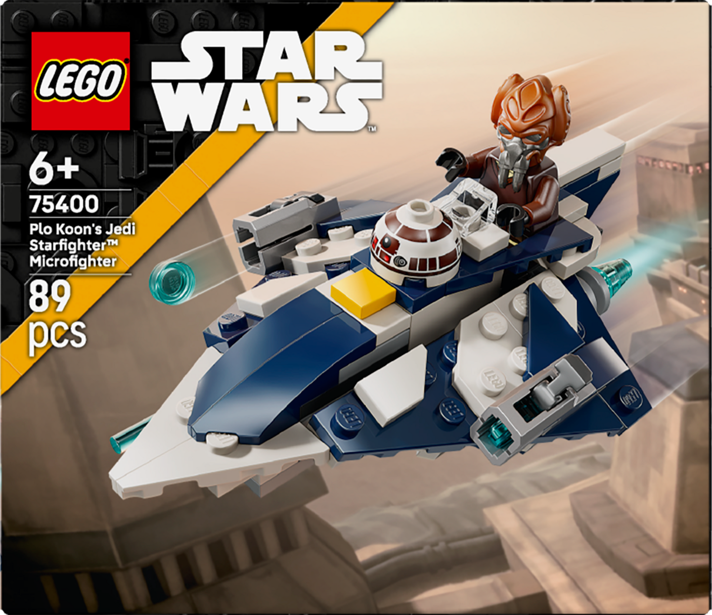 Tämä mielikuvitusrikas rakennussarja sisältää myös Plo Koonin LEGO minihahmon sinisine valomiekkoineen, joka kiinnittyy mikrohävittäjän alarunkoon. Ohjaamon edessä olevaan runkoon voi kiinnittää R7-D4-pääosan, jotta luotettava Star Wars droidi pääsee Plo Koonin seikkailujen perämieheksi.