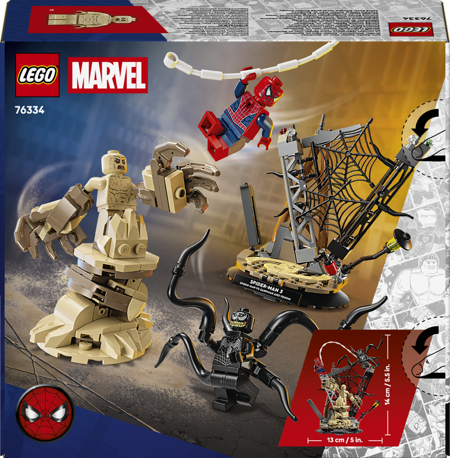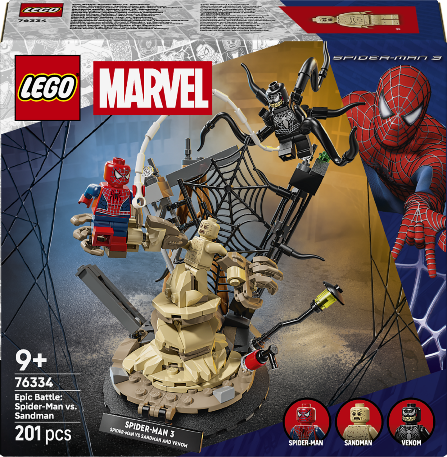 LEGO® ǀ Marvel Eeppinen taistelu: Spider-Man vastaan Sandman (76334) rakennussetin parissa 9 vuotta täyttäneet pojat ja tytöt voivat leikkiä kohtauksia Marvel Studiosin Spider-Man 3 ‑elokuvasta. Setti sisältää 3 tuttua minihahmoa – Spider-Manin, Venomin ja Sandmanin – jotka ovat omiaan niin huikeisiin seikkailuleikkeihin kuin sisustusesineiksikin.