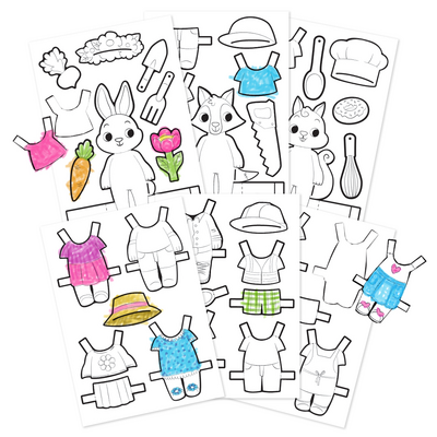 Väritä, leikkaa ja leiki! Perinteinen paperinukkeleikki suloisilla eläinhahmoilla. Paperinukkeleikissä seikkailevat kokkailua rakastava orava, puutarhanhoidosta innostunut pupu ja kädentaidoistaan tunnettu kettu. Pue paperinukeille erilaisia asuja ja ohjaa heitä päivän askareissa. Samalla opit leikkien hienomotoriikkaa, luovuutta ja kommunikaatiotaitoja. Sisältää kuusi kartonkiarkkia (koko A5), joissa on yli 40 osaa. Eläinpaperinuken pituus n. 12-14 cm. Pakkaus avautuu väritettäväksi kulissiksi paperinukkeleikkeihin!