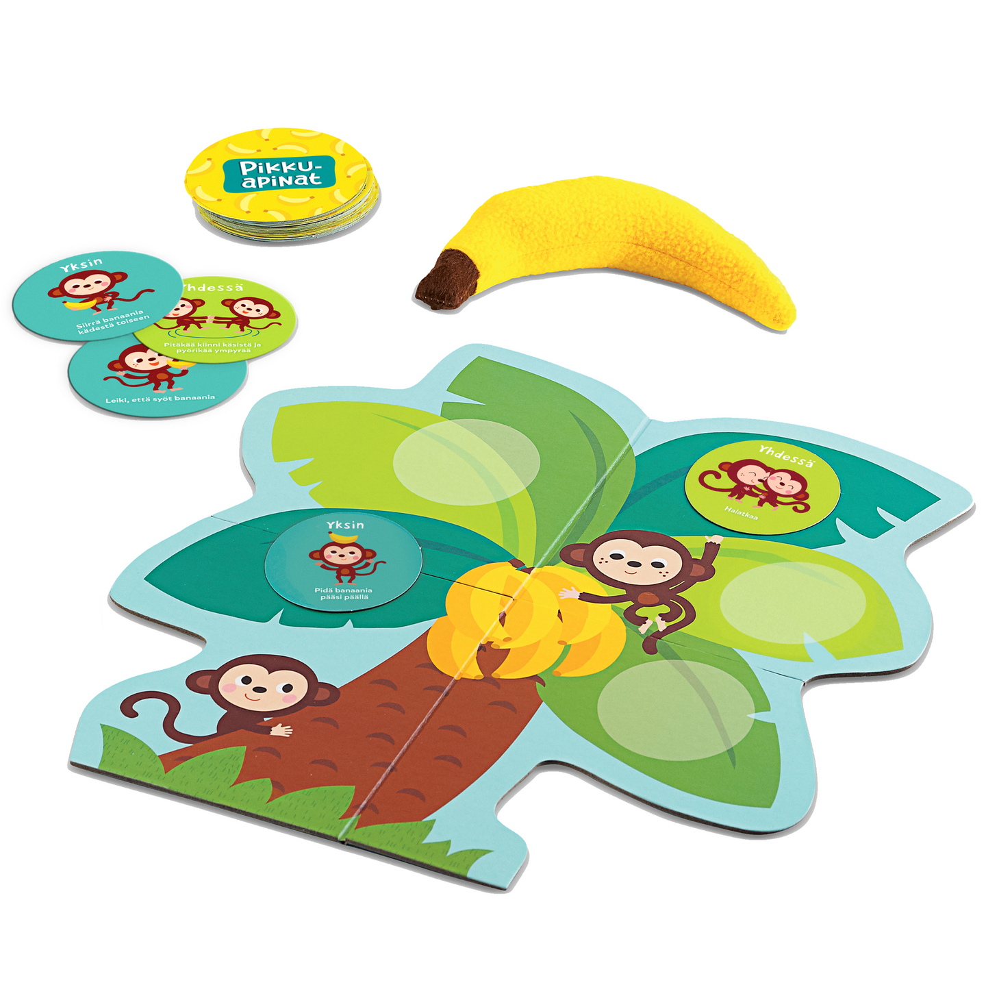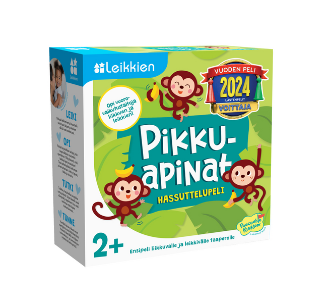 Leikkien Pikkuapinat lastenpelion lystikäs ensipeli liikkuvalle ja leikkivälle taaperolle!Leikkikää, liikkukaa ja naurakaa yhdessä! Pikkuapinat on liikunnallinen ja leikkisä peli yli 2-vuotiaille lapsille pelattavaksi yhdessä aikuisen kanssa.