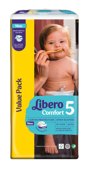 Libero Comfort 5 on Joutsenmerkitty teippivaippa, joka sopii 10-14 kg painoisille lapsille. Ohuen ja pehmeän vaipan joustavat sivut sekä pehmeä vyötäröresori takaavat hyvän istuvuuden ja estävät ohivuotoja. Hyvä imukyky ja hengittävä materiaali pitävät ihon kuivana. Libero Comfort -vaippaa valmistetaan kokoa 3, 4, 5, 6 ja 7. Eri vaippakokojen painorajat ovat osittain päällekkäisiä. Jos vaippa vuotaa, kokeile joko suurempaa tai pienempää kokoa.