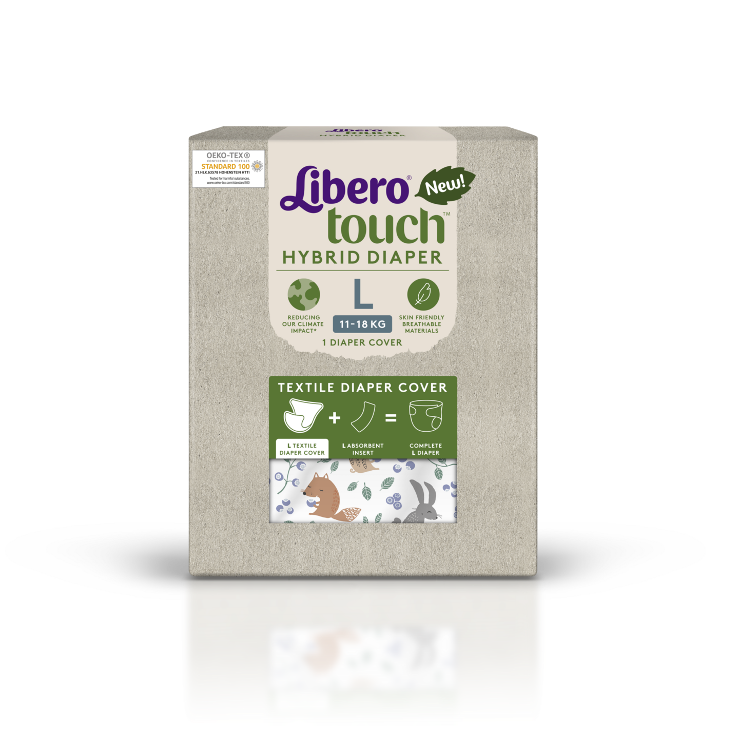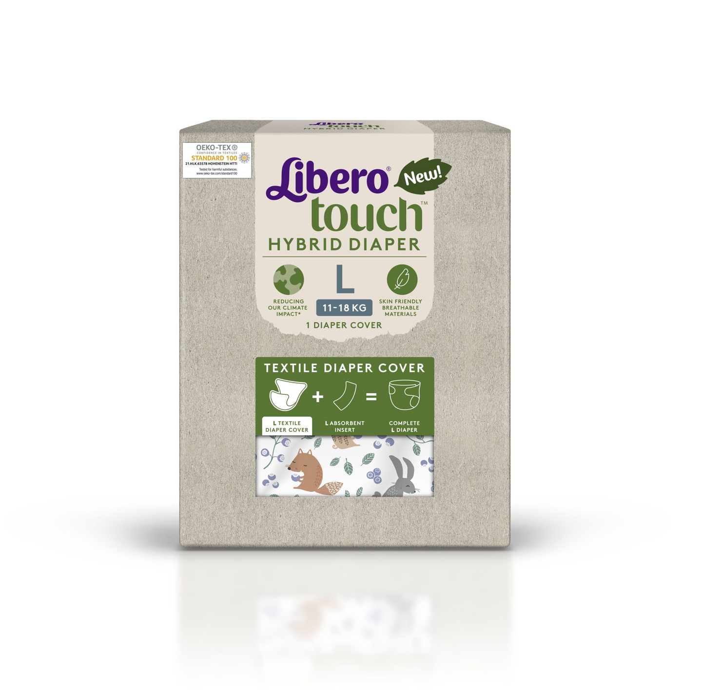 Libero Touch Hybrid on ilmastoviisas kaksiosainen vaippa, jossa uudelleenkäytettävät tekstiilihousut yhdistyvät imukykyiseen sisäosaan. Koko Large sopii parhaiten lapsille, jotka painavat 11–18 kg. M-kokoisia tekstiilihousuja käytetään yhdessä samankokoisten imukykyisten sisäosien kanssa. Libero Touch Hybrid-vaipan ilmastovaikutus on 35 % pienempi verrattuna Liberon kertakäyttövaippaan. Libero Touch Hybrid on erittäin helppokäyttöinen. Pestävät tekstiilihousut on valmistettu kierrätetystä polyesteristä ja ne on ÖKO-TEX®-sertifioitu. Imukykyiset sisäosat ovat Asthma Allergy Nordicin suosittelemia, voiteettomia ja dermatologisesti testattuja. Se on myös Joutsenmerkitty ja FSC-sertifioitu.