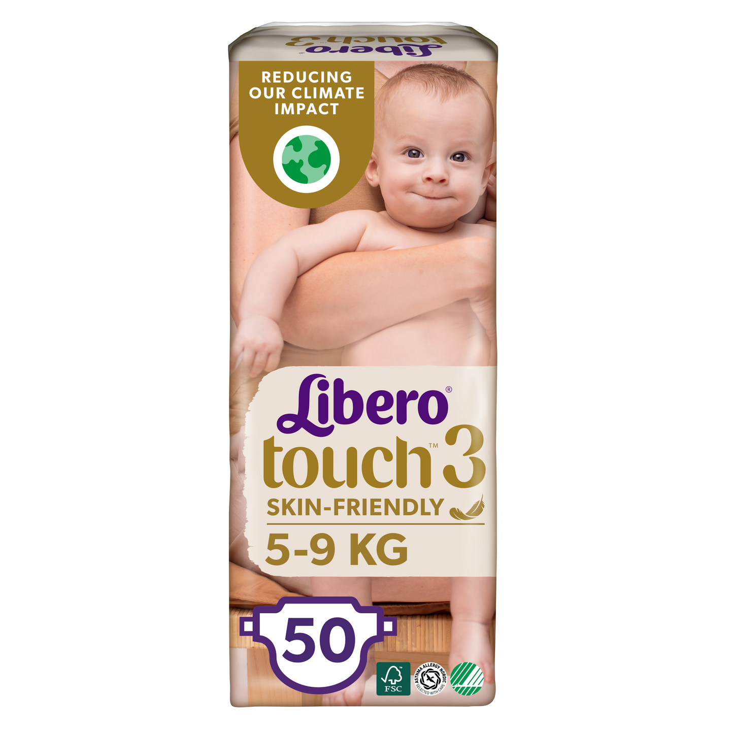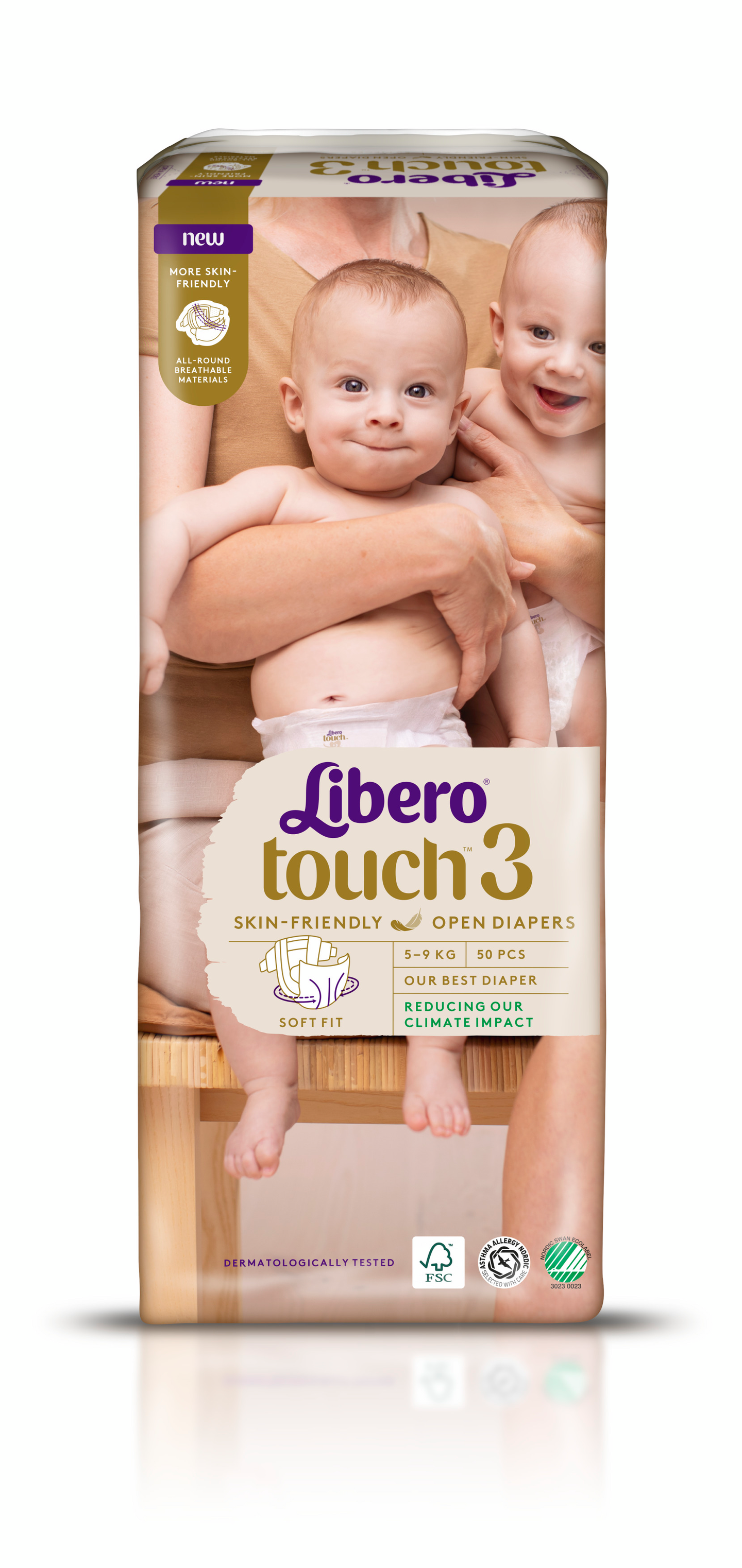 Libero Touch™ koko 3 -vaipan pehmeän ja myötäilevän istuvuuden takaavat erittäin pehmeät ja hengittävät materiaalit sekä ohut ja joustava ydin. Osana Liberon tavoitetta vähentää ilmastovaikutuksia, yli 50 % pakkauksesta on valmistettu uusiutuvista materiaaleista ja Liberon vaippatehtaissa käytetään vain uusiutuvaa sähköä. Teippivaipat sopivat täydellisesti pienille lapsille, jotka painavat 5-9 kg. Kätevä kosteusindikaattori osoittaa, milloin on vaipanvaihdon aika. Vaippa myötäilee jokaista pientä liikettä ja hoitaa hellävaraisesti vauvasi ihoa. Liberon pehmeimmät ja parhaat teippivaipat ovat dermatologisesti testattuja, Joutsenmerkittyjä ja myös Asthma Allergy Nordicin suosittelemia.