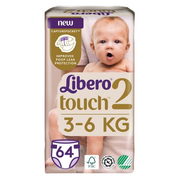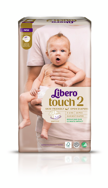 Libero Touch™ koko 2 -vaipan pehmeän istuvuuden takaavat ohut ja joustava ydin sekä erittäin pehmeät ja hengittävät materiaalit. Ohut ja joustava, kanavilla varustettu ydin antaa Liberon parhaalle vaipalle pehmeän istuvuuden. Osana Liberon tavoitetta vähentää ilmastovaikutuksia, yli 50 % pakkauksesta on valmistettu uusiutuvista materiaaleista ja Liberon vaippatehtaissa käytetään vain uusiutuvaa sähköä. Kun vauvasi painaa 3-6 kg, teippivaippa istuu täydellisesti. Lisäksi kätevä kosteusindikaattori osoittaa, milloin on vaihdon aika. Vaipan etuosassa on myös hellävarainen muotoilu, joka suojaa vauvasi herkkää napaa. Liberon pehmein ja paras teippivaippa myötäilee pienokaisesi jokaista liikettä. Dermatologisesti testatut vaipat ovat Asthma Allergy Nordicin suosittelemia ja Joutsenmerkittyjä.