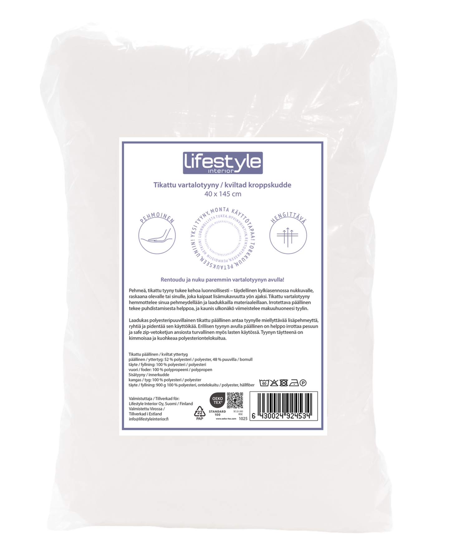 Lifestyle tikatussa vartalotyynyssä 52 % polyesteri 48 % puuvillakangas. Tikattu päällinen antaa lisäpehmeyttä ja tukea. Tikatun päällisen täytteenä 100 % polyesterivanua. Tikatussa päällisessä safe zip-vetoketju, turvallinen myös lasten käytössä. Tyynyn sisus 900 g laadukasta ja kuohkeaa 100 % polyesteri, ontelokuitua. GRS-standardin mukaan valmistettua kierrätyskuitua. Vartalotyynyssä erillinen sisätyyny, jonka ansiosta tikattu päällinen on helppo irrottaa pesuun. Sisätyynyn kangas 100 % polyesteri, mikrokuitua. Tuote on tutkitusti haitta-aineeton ja takaa turvalliset ja raikkaat unet. Öko-Tex-standard 100. Pesu 60 °C.