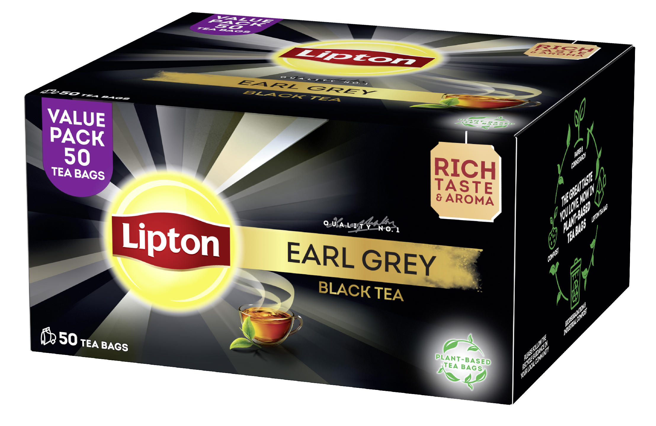 Maista auringonpaistetta... Lipton Rich Earl Grey -teen jokaisessa siemauksessa maistuvat vivahteikkaat aromit. Valmistettu auringossa kypsyneistä, vastapoimituista ja huolella valituista teelehdistä. Lipton Rich Earl Grey -tee sisältää kiehtovaa bergamotia, joka antaa teelle sen nautinnollisen syvän aromaattisen maun. Lipton Freshpack -foliosuojukset on kehitetty erityisesti säilyttämään ja vangitsemaan herkulliset maut. Aurinkoinen siemaus herättää sinut maailman ihmeisiin.
