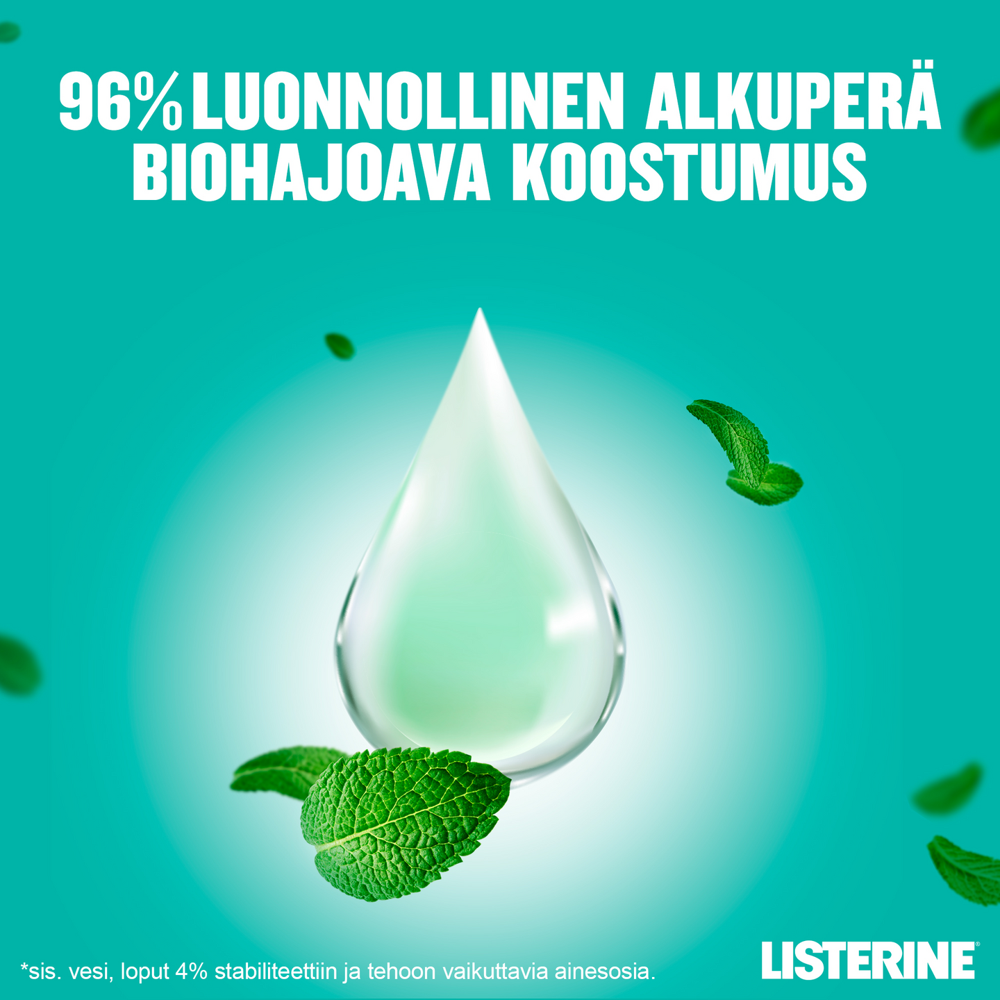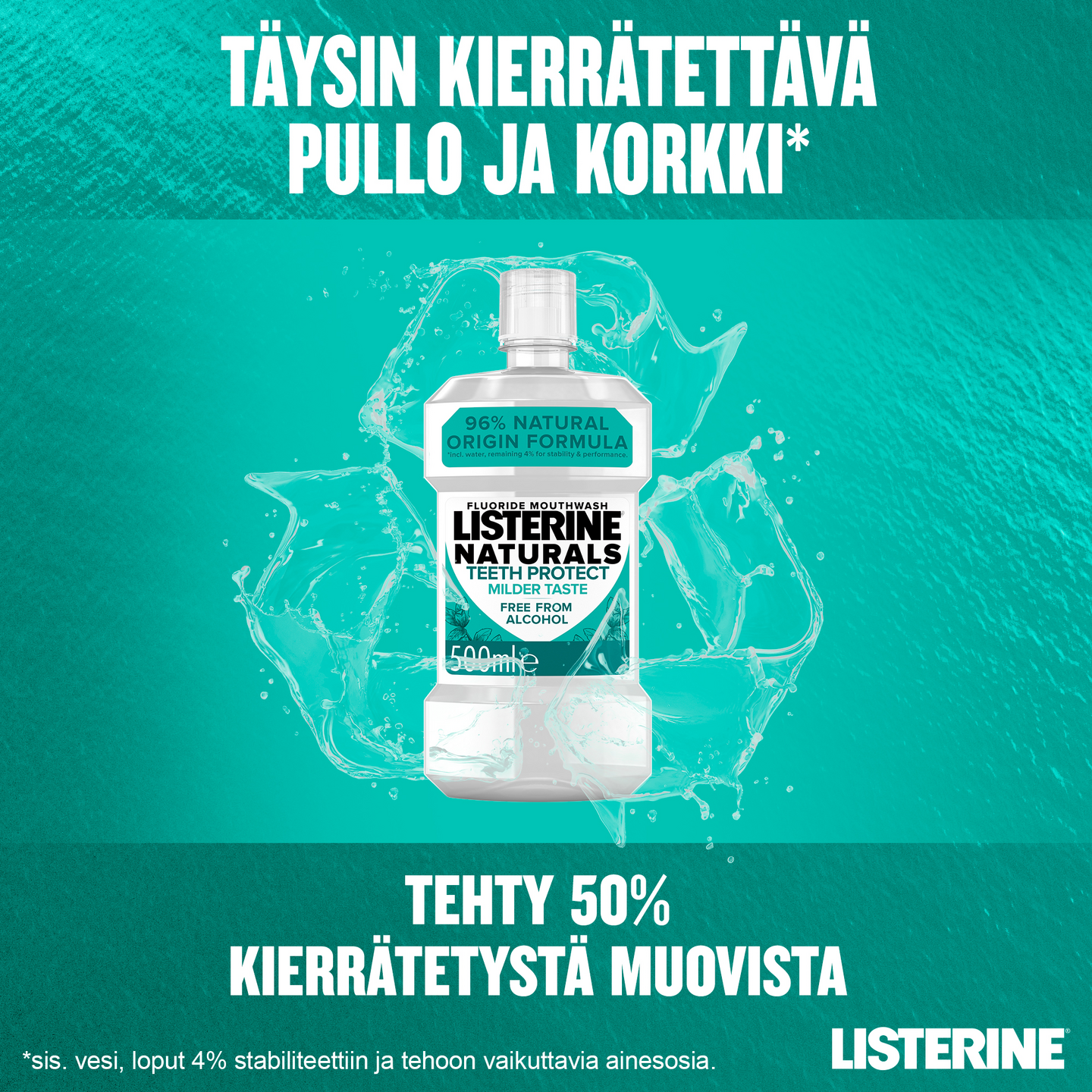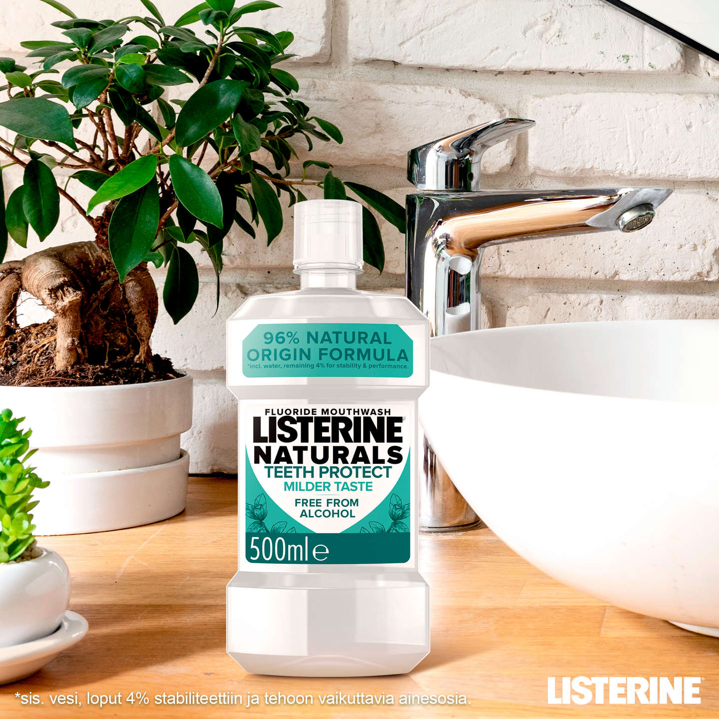 Listerine® Naturals Teeth Protect Milder Taste ainesosat ovat 96% luonnollista alkuperää ja täysin biohajoavia. Sisältää fluoria, joka vahvistaa hampaita, suojaa kiillettä ja auttaa ehkäisemään reikiintymistä. Eteeristen öljyjen antibakteeriset ominaisuudet jättävät koko suun puhtaaksi ja raikkaaksi. Poistaa jopa 97% plakkia ja pahanhajuista hengitystä aiheuttavista bakteereista, jotka jäävät jäljelle pelkän hampaiden harjauksen jälkeen. Alkoholiton ja väriaineeton, sopii vegaaneille. Miedompi mintun maku. Viimeistele suun hoitosi - suuvesi puhdistaa sieltä, minne hammasharja ei yllä: vähentää plakin muodostumista - vähentää bakteereja.