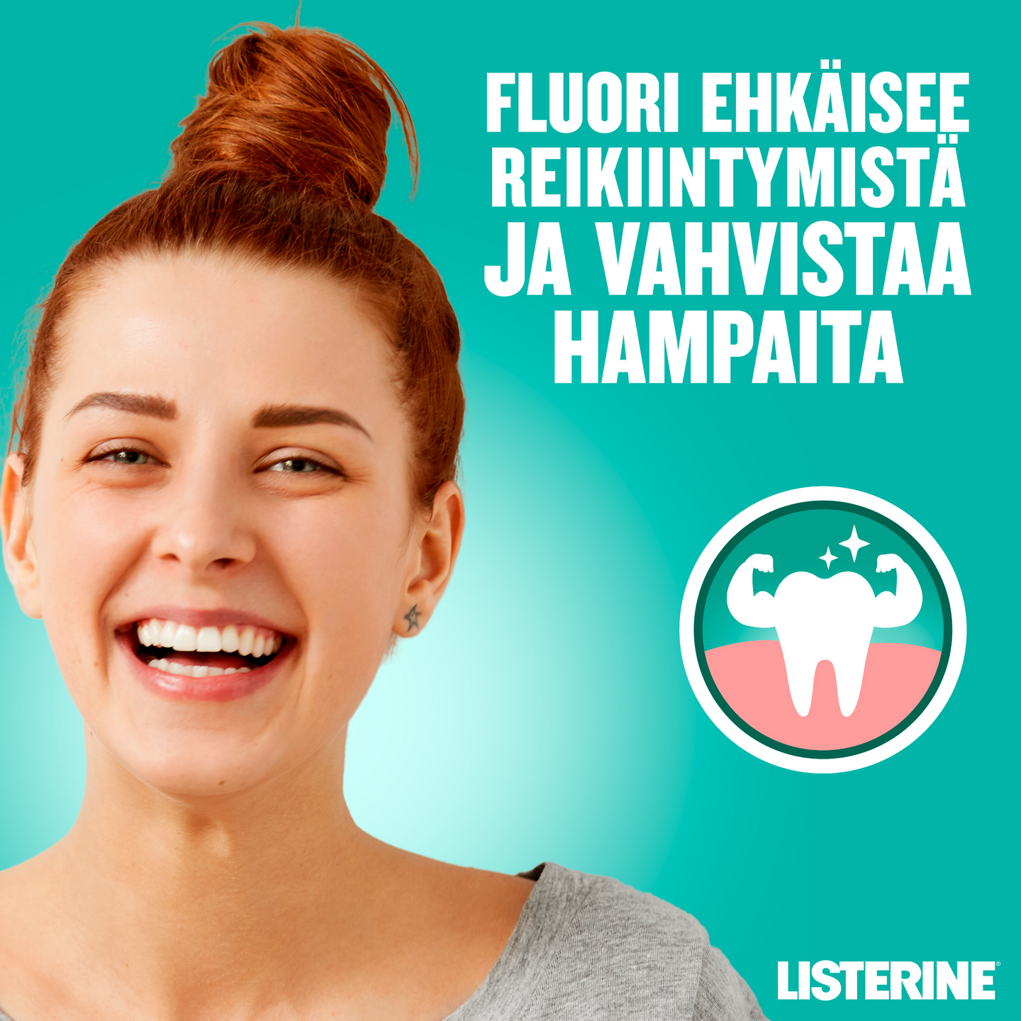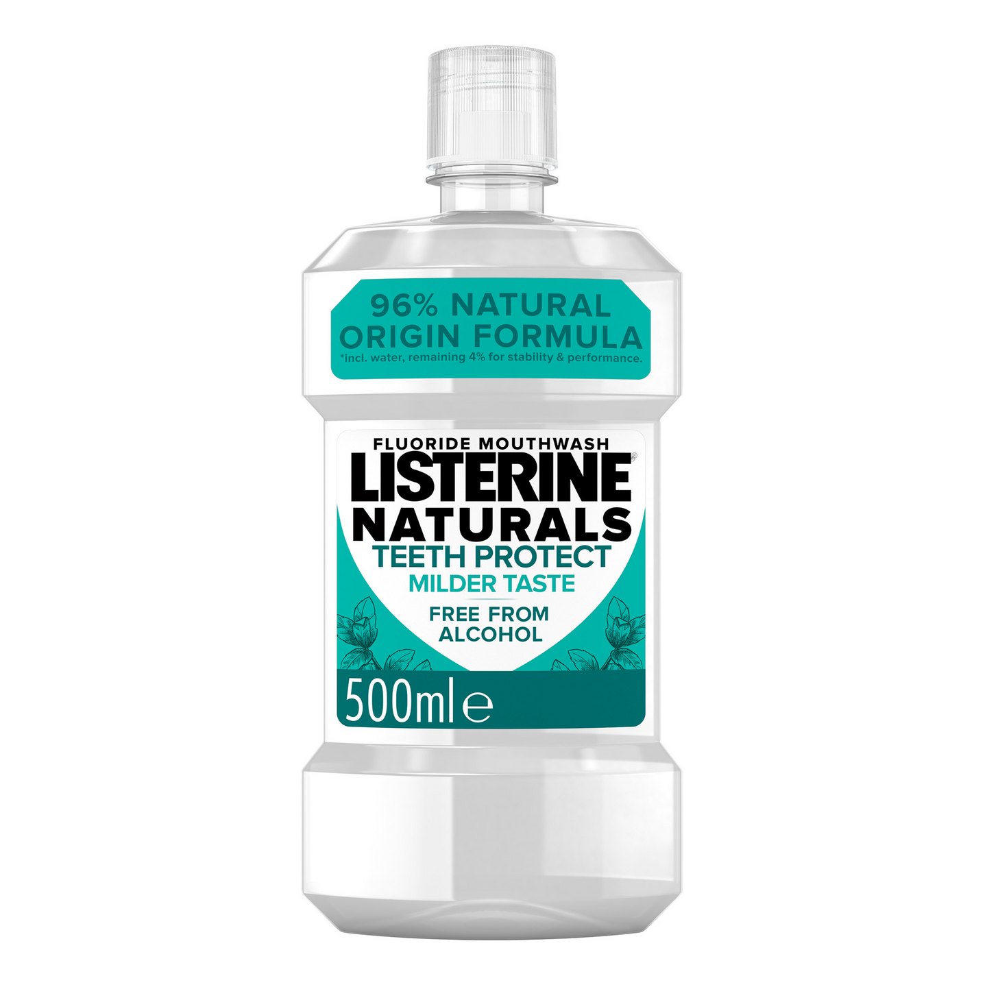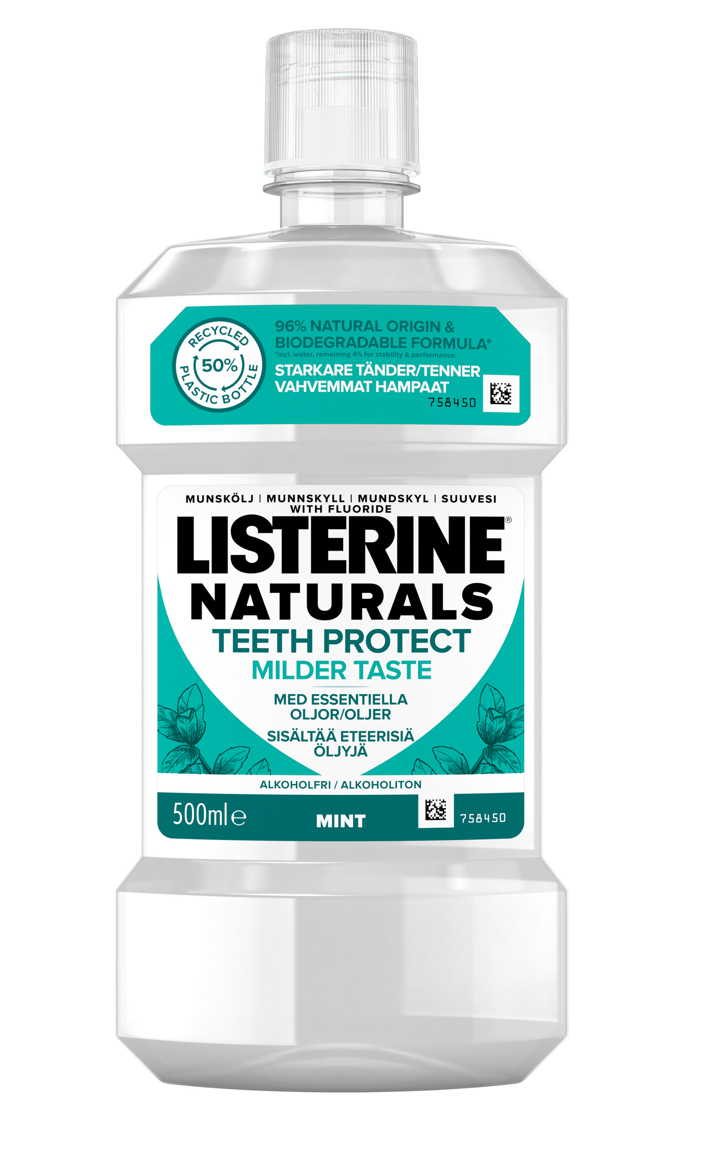 Listerine® Naturals Teeth Protect Milder Taste ainesosat ovat 96% luonnollista alkuperää ja täysin biohajoavia. Sisältää fluoria, joka vahvistaa hampaita, suojaa kiillettä ja auttaa ehkäisemään reikiintymistä. Eteeristen öljyjen antibakteeriset ominaisuudet jättävät koko suun puhtaaksi ja raikkaaksi. Poistaa jopa 97% plakkia ja pahanhajuista hengitystä aiheuttavista bakteereista, jotka jäävät jäljelle pelkän hampaiden harjauksen jälkeen. Alkoholiton ja väriaineeton, sopii vegaaneille. Miedompi mintun maku. Viimeistele suun hoitosi - suuvesi puhdistaa sieltä, minne hammasharja ei yllä: vähentää plakin muodostumista - vähentää bakteereja.