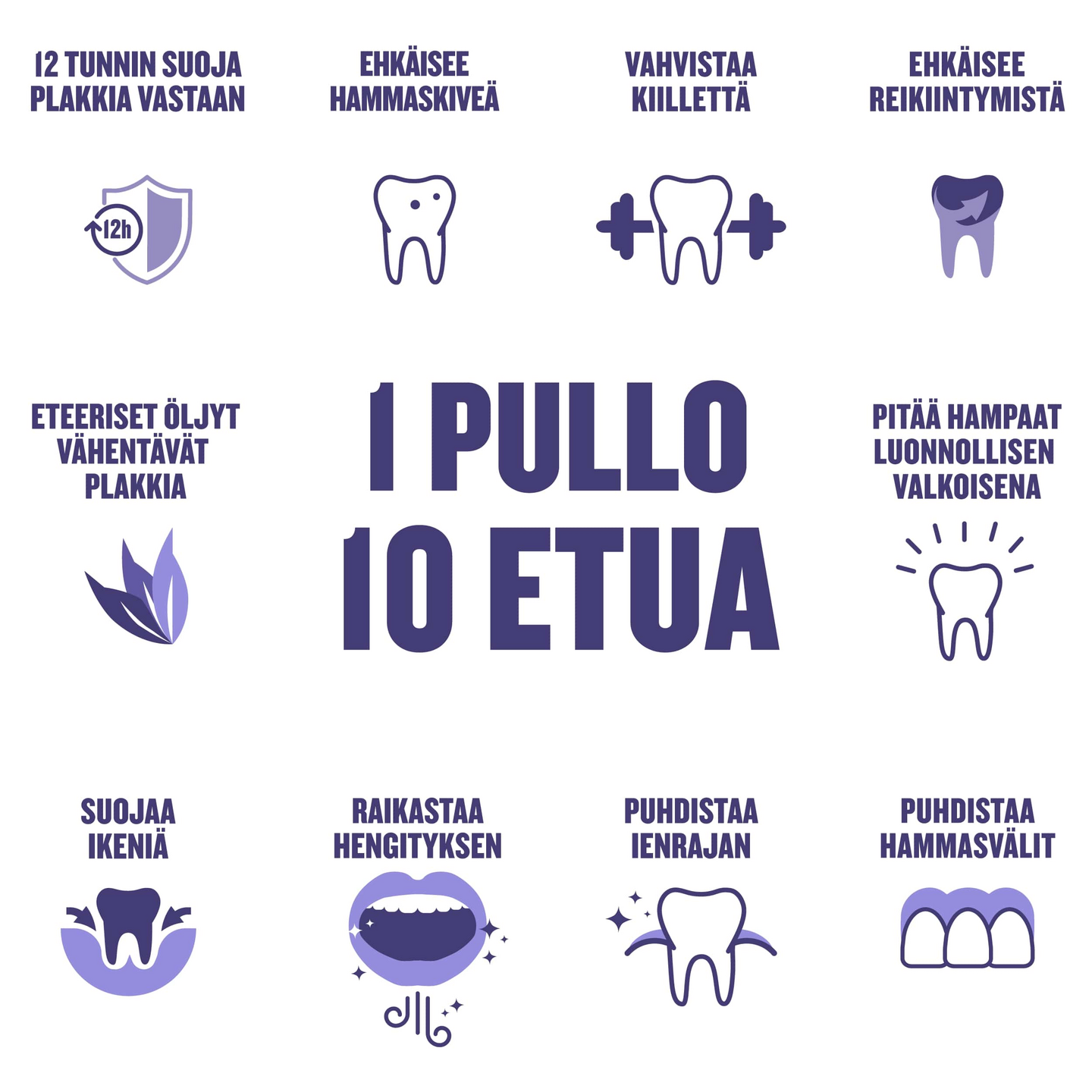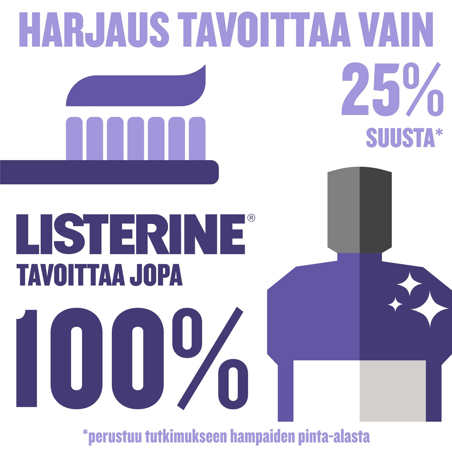 Hammaskiven ehkäisyyn - 10 etua yhdessä! LISTERINE® Total Care -suuvesi ehkäisee hammaskiveä, vähentää plakkia, suojaa ikeniä ja raikastaa hengityksen 12 tunniksi. Se sisältää hampaita vahvistavaa fluoria ja suojaa reikiintymiseltä. LISTERINE® Total Care ehkäisee hammaskiven muodostumista 21 % enemmän kuin pelkkä hampaiden harjaaminen. Käytä kahdesti päivässä hampaiden harjauksen jälkeen. Yli 12-vuotiaille. Saatavilla myös alkoholiton, miedomman makuinen vaihtoehto, LISTERINE® Total Care Milder Taste.