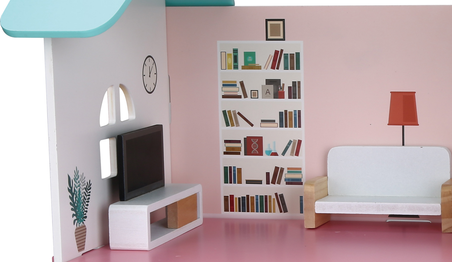 Puinen nukketalo on kaksikerroksinen ja sen mukana tulee puisia kalusteita. Nukkekodin koko 45 x 42 x 23 cm. 3+