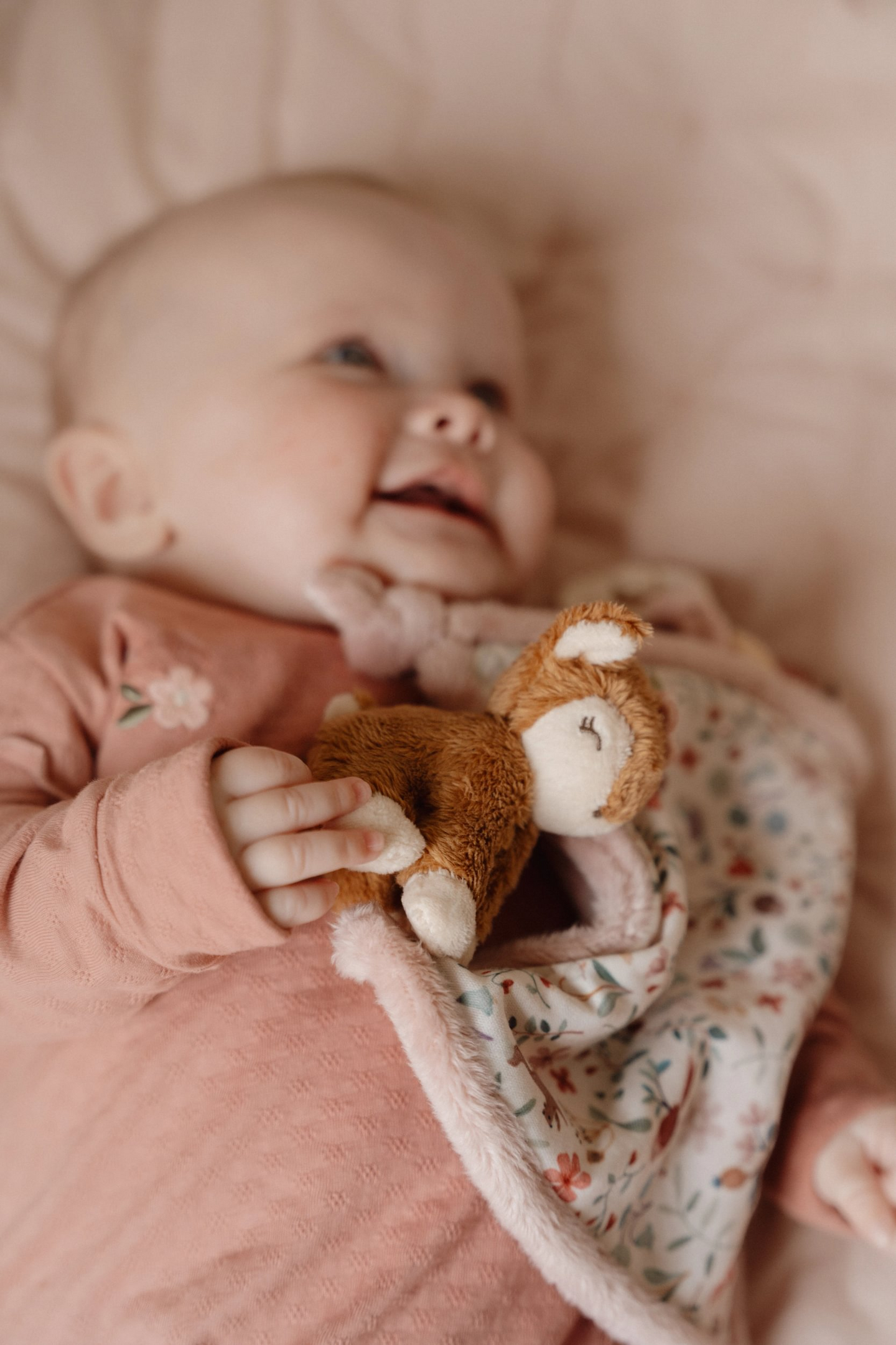 Helli ja lohduta pienokaistasi tällä pehmeällä uniliinalla. Fairy Garden -kuosilla koristeltu uniliina tarjoaa vauvalle paljon tutkittavaa: erilaisia aistikokemuksia tarjoavia lappuja, helposti tartuttavia solmuja sekä lenkin, johon voi kiinnittää tutin tai purulelun. Pehmeä pieni peura tekee kankaasta erityisen suloisen ja halattavan. Täydellinen lohtukaveri missä ja milloin tahansa.