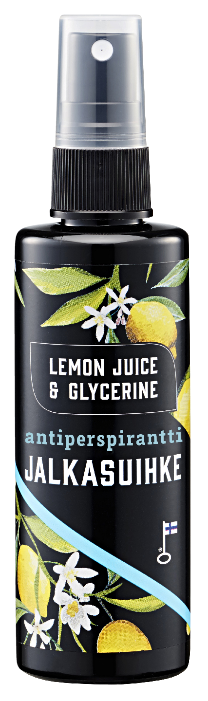 Jalat raikastava ja jalkojen hikoilua estävä antiperspirantti jalkasuihke. Sisältää etanolia ja alumiiniklorohydraattia sekä viilentävää mentolia. Raikas sitruksen tuoksu. Valmistettu Suomessa.