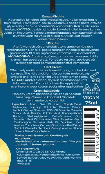Lemon Juice & Glycerine Kantapäävoide kosteuttaa, pehmentää ja hoitaa tehokkaasti jalkojen ja kantapäiden kuivaa, halkeilevaa ihoa sekä kovettumia. Täyteläinen, paksu koostumus sisältää 18 % pehmentävää karbamidia ja kosteuttavaa glyseriiniä. Raikas sitruunainen tuoksu täydentää virkistävän käyttökokemuksen. Vegaaninen koostumus. Valmistettu Suomessa.