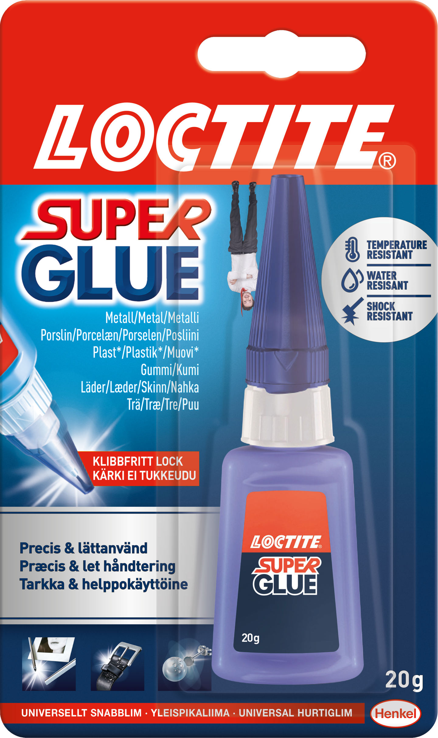 Loctiten monikäyttöinen ja luotettava Super Glue 20g on nopeasti kovettuvaja luja pikaliima. Se kuivuu läpinäkyväksi muutamassa sekunnissa ja muodostaa kestävän ja näkymättömän liitoksen. Tukkeutumista ehkäisevä korkki, jolla tuubin suojakalvo voidaan puhkaista. Uusittu koostumus kestää: vettä ja konepesua, iskut -50... +120C:n lämpötilat, Käyttökohteet: Posliini, metalli, kumi, nahka, puu, muovi, paperi. Paitsi polyeteeni (PE) ja polypropeeni (PP). Tuote ei sovellu lasin, Styroporin (styroksi) tai keinokuitujen liimaamiseen.