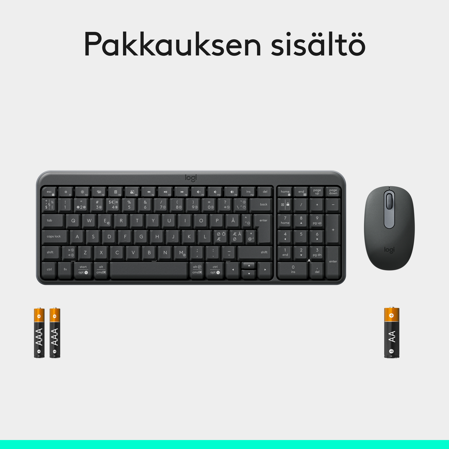 Pakkauksen sisältö: näppäimistö ja 2 x AAA-paristoa (valmiiksi asennettu), hiiri ja 1 x AA-paristo (valmiiksi asennettu), käyttäjän dokumentaatio, pikaopas painettu pakkaukseen