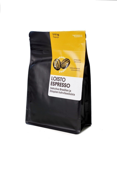 Kahden kahvin espressosekoitus. Brasilialainen kahvi tuo pehmeyttä ja runkoa, Etiopia marjaisuutta ja hapokkuutta. Lopputuloksena ryhdikäs espresso, josta löytyy marjaista vivahdetta. Sopii espressolaitteelle tai mutteripannulle, maidolla tai ilman.