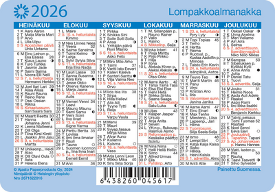 Klassikko, joka kulkee kätevästi mukana. Koko 100 x 70 mm; muovinen; puolen vuoden jakso molemmilla puolilla; kirkkopyhät, juhlapäivät ja runsaasti nimipäiviä; viivain; painettu Suomessa.
