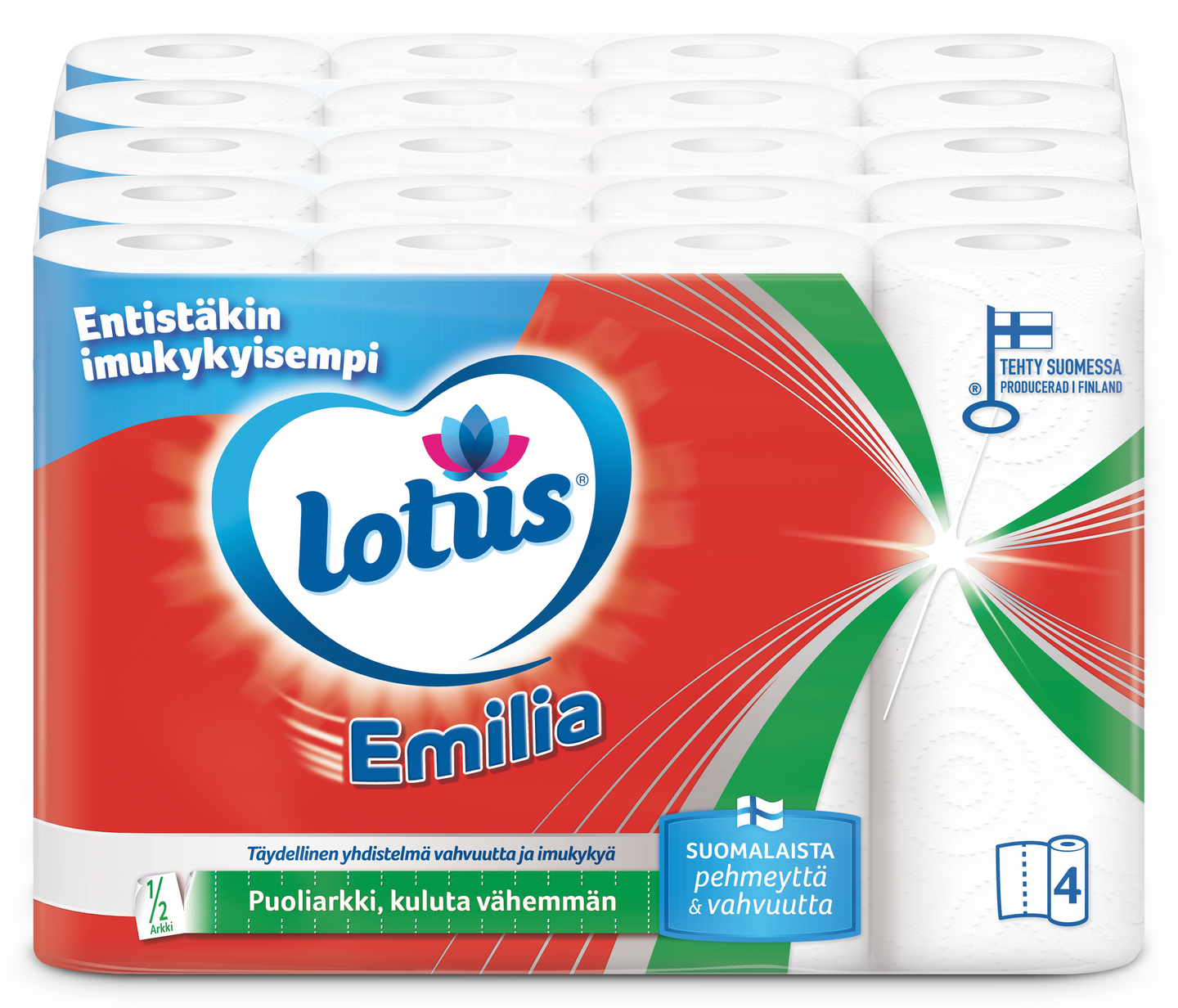Lotus Emilia puoliarkillinen talouspaperi on täydellinen yhdistelmä vahvuutta ja imukykyä. Se soveltuu hyvin pintojen pyyhkimiseen ja puhdistamiseen, sillä se on vahvaa myös kosteana. Lotus Emilia puoliarkillinen talouspaperi on arkkikokonsa ansiosta myös taloudellinen ja ympäristöystävällinen vaihtoehto. Kaikki Lotus Emilia talouspaperit valmistetaan Suomessa Nokian paperitehtaalla. Lotus Emilia talouspaperilla on myös Joutsenmerkki ja se on valmistettu FSC-sertifioidusta kuidusta (kuituraaka-aineet: selluloosa, kierrätyskuitu). Rullat on pakattu kierrätettävään pakkaukseen, joka sisältää vähintään 30% kierrätysmuovia pakkauksen hiilijalanjäljen pienentämiseksi.