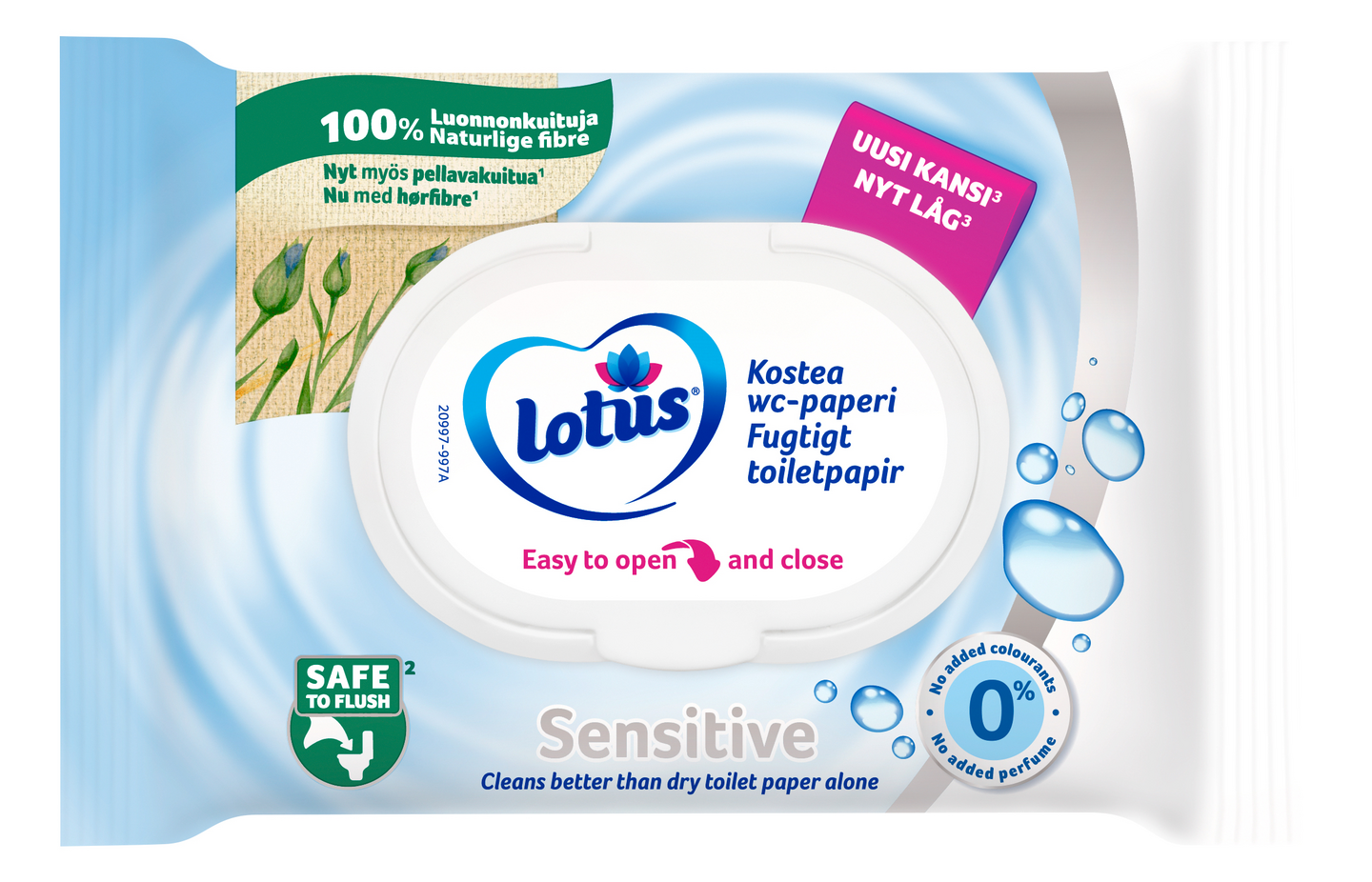 Lotus Sensitive Kostea wc-paperi puhdistaa paremmin kuin kuiva vessapaperi yksin. Kokeile täydellistä kaksivaiheista yhdistelmää, käytä ensin kuivaa Lotus-vessapaperia ja sen jälkeen kosteaa wc-paperia. Tällä rutiinilla saat puhtaan ja raikkaan tunteen joka kerta. Turvallinen huuhtoa, kuten kuiva wc-paperi. Lotus Sensitive Kostea wc-paperi puhdistaa tehokkaasti ja on hellä ihollesi. Nämä dermatologisesti testatut ja huuhdottavat arkit ovat pH-ihoneutraaleja, eikä niihin ole lisätty väriaineita eikä hajusteita. Lisäksi niiden kierrätettävässä pakkauksessa on suojaava ja helppokäyttöinen kova kansi, joka pitää ne kosteina ja hygieenisinä. Valmistettu FSC-sertifioidusta 100% luonnonkuidusta, Lotus kosteat wc-paperiarkit on suunniteltu ympäristöä kunnioittaen.