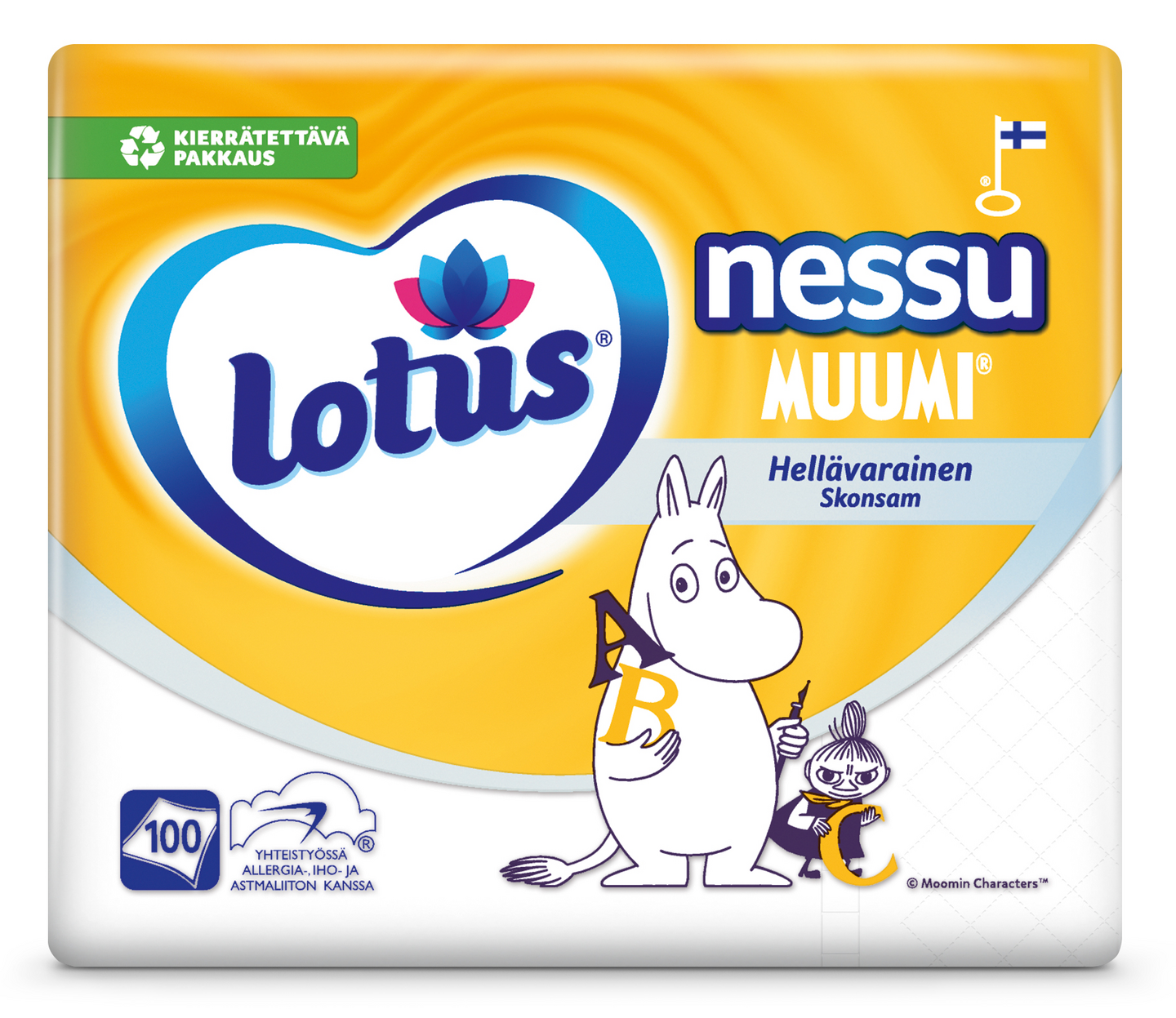 Lotus Nessu Muumi on pehmeä ja hygieeninen nenäliina, jonka painokuosissa seikkailevat suomalaisten rakastamat muumihahmot. Nenäliinoissa on kolme paperikerrosta ja pakkauksessa on 100 nenäliinaa. Tuotteella on Allergia-, iho- ja astmaliiton myöntämä Allergiatunnus sekä EU Ecolabel -ympäristömerkki. Lotus Nessu Muumi nenäliinat valmistetaan Suomessa Nokian paperitehtaalla. Tuote on valmistettu FSC-sertifioidusta kuidusta (Kuituraaka-aine: selluloosa). Kierrätettävä pakkaus.