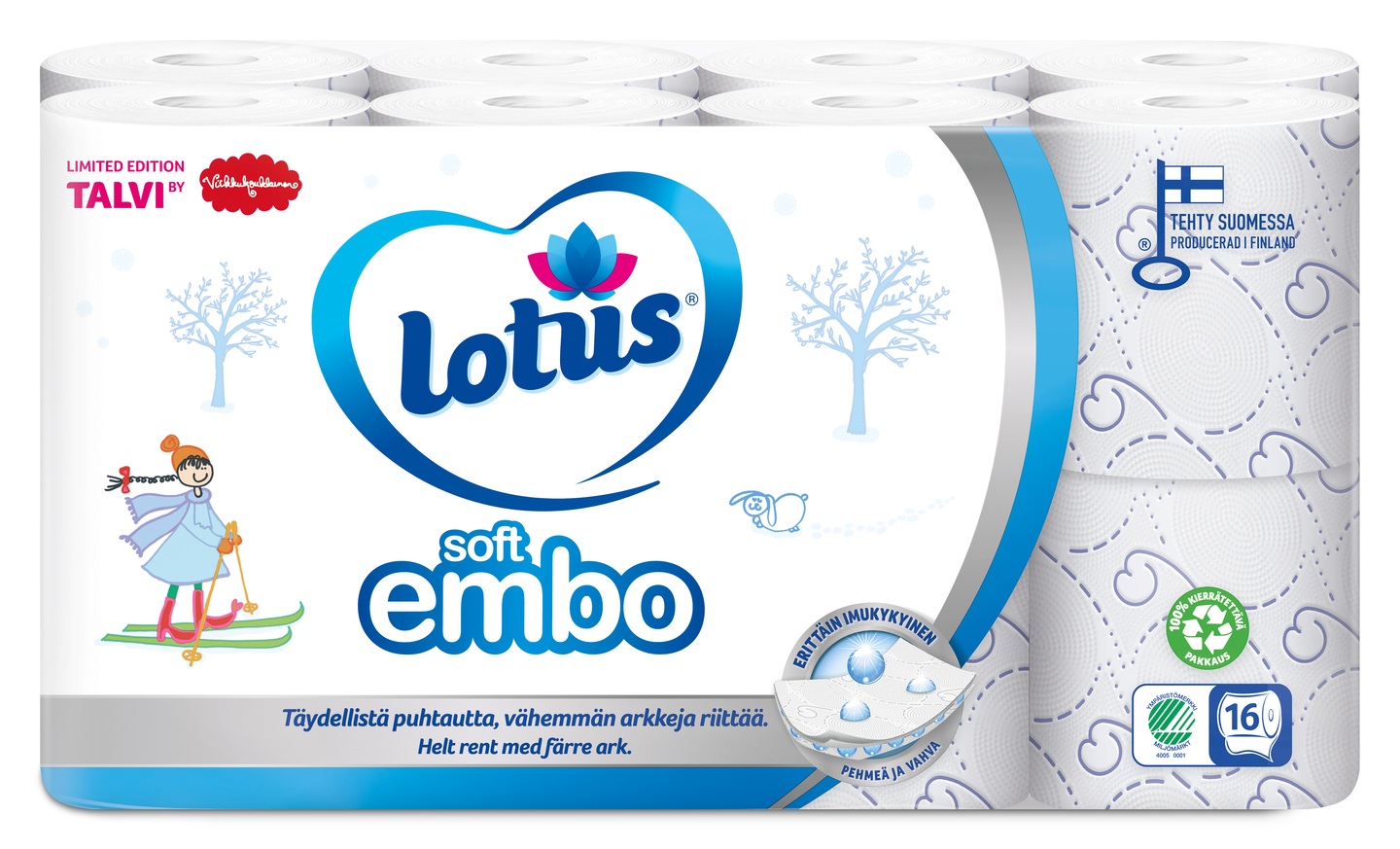 Korkealaatuinen ja luotettava Lotus Soft Embo -wc-paperi on ollut suomalaisten suosikkipaperi jo yli 40 vuoden ajan. Lotus Soft Embon täydellinen yhdistelmä pehmeyttä ja imukykyä takaa erityisen miellyttävän käyttökokemuksen. Hellävarainen Lotus Soft Embo sopii myös herkemmälle iholle. Lotus Soft Embo -wc-paperirullissa on Flush&Go® -hylsy, jonka voi kierrättää, kompostoida tai huuhtoa. Flush&Go® -hylsy hajoaa veteen kuten wc-paperi. Lotus Soft Embo valmistetaan Suomessa Nokian paperitehtaalla. Tuotteella on Joutsenmerkki ja se on dermatologisesti testattu. Valmistettu FSC-sertifioidusta kuidusta. Rullat on pakattu kierrätettävään pakkaukseen, joka sisältää vähintään 30% kierrätysmuovia pakkauksen hiilijalanjäljen pienentämiseksi.