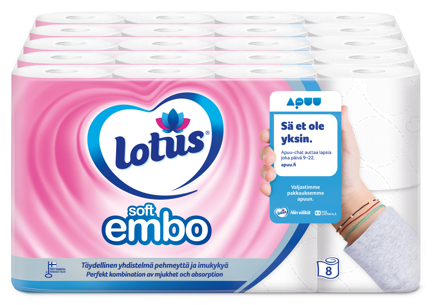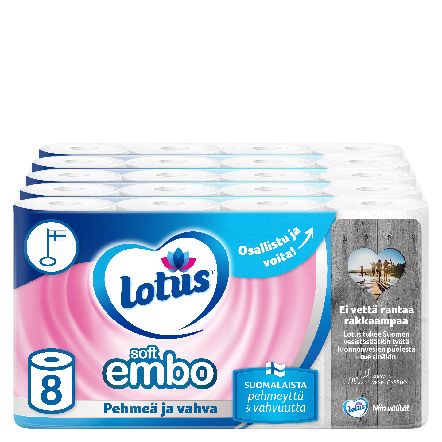 Korkealaatuinen ja luotettava Lotus Soft Embo -wc-paperi on ollut suomalaisten suosikkipaperi jo yli 40 vuoden ajan. Lotus Soft Embon täydellinen yhdistelmä pehmeyttä ja imukykyä takaa erityisen miellyttävän käyttökokemuksen. Hellävarainen Lotus Soft Embo sopii myös herkemmälle iholle. Lotus Soft Embo -wc-paperirullissa on Flush&Go® -hylsy, jonka voi kierrättää, kompostoida tai huuhtoa. Flush&Go® -hylsy hajoaa veteen kuten wc-paperi. Lotus Soft Embo valmistetaan Suomessa Nokian paperitehtaalla. Tuotteella on Joutsenmerkki ja se on dermatologisesti testattu. Valmistettu FSC-sertifioidusta kuidusta. Rullat on pakattu kierrätettävään pakkaukseen, joka sisältää vähintään 30% kierrätysmuovia pakkauksen hiilijalanjäljen pienentämiseksi.