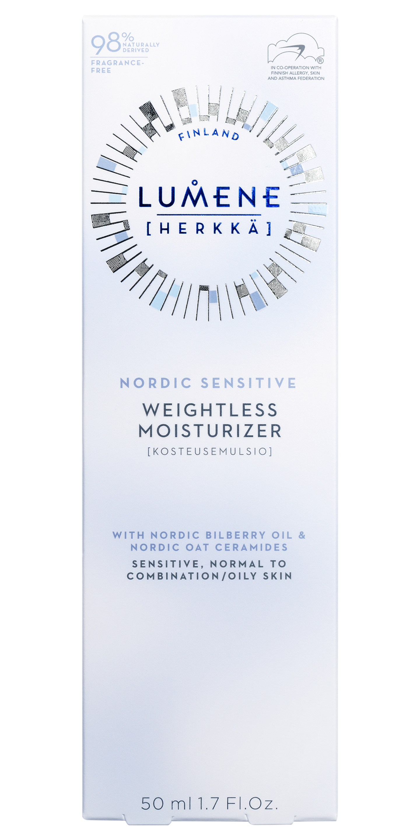 Kevyt, hajusteeton emulsiokosteusvoide rauhoittaa herkkää ihoa välittömästi ja vahvistaa vahingoittunutta ihon suojakerrosta. Kliinisesti testattu herkällä iholla. Kehitetty yhteistyössä Astma-, iho- ja allergialiiton kanssa. LUMENE [Herkkä] Nordic Sensitive Rauhoittava kosteusemulsio on keramideilla tehostettu kevyt voide herkälle, normaalille ja seka-/rasvoittuvalle iholle. Hyödyntämällä ihon suojakerrosta tukevaa pohjoista kaurakeramidia ja rauhoittavaa mustikkaöljyä, tämä raikas koostumus rauhoittaa ihoa välittömästi, kosteuttaa intensiivisesti ja vahvistaa ihon suojakerrosta saaden aikaan hyvinvoivan näköisen ja rauhoittuneen tuntuisen ihon. Kevyt, lähes juokseva koostumus antaa iholle rauhoittavaa hoivaa jättämättä ihoa rasvaisen tai raskaan tuntuiseksi. KLIINISESTI TESTATTU: Vahvistaa ihon suojakerrosta* 100% mielestä ihon kuiva ja kireä tunne vähenee välittömästi** Hajusteeton ja vegaaninen päivävoide sisältää sivuvirroista kehitettyjä ja pohjoisen luonnosta peräisin olevia raaka-aineita. Pakkauksessa on käytetty kierrätettyjä ja kierrätettäviä materiaaleja. Valmistettu Suomessa. Käyttö: Levitä puhtaalle kasvojen ja kaulan iholle. Parhaan tuloksen saadaksesi käytä yhdessä seerumin kanssa. LUMENE – Korkealaatuista pohjoista kauneutta paremman tulevaisuuden puolesta.