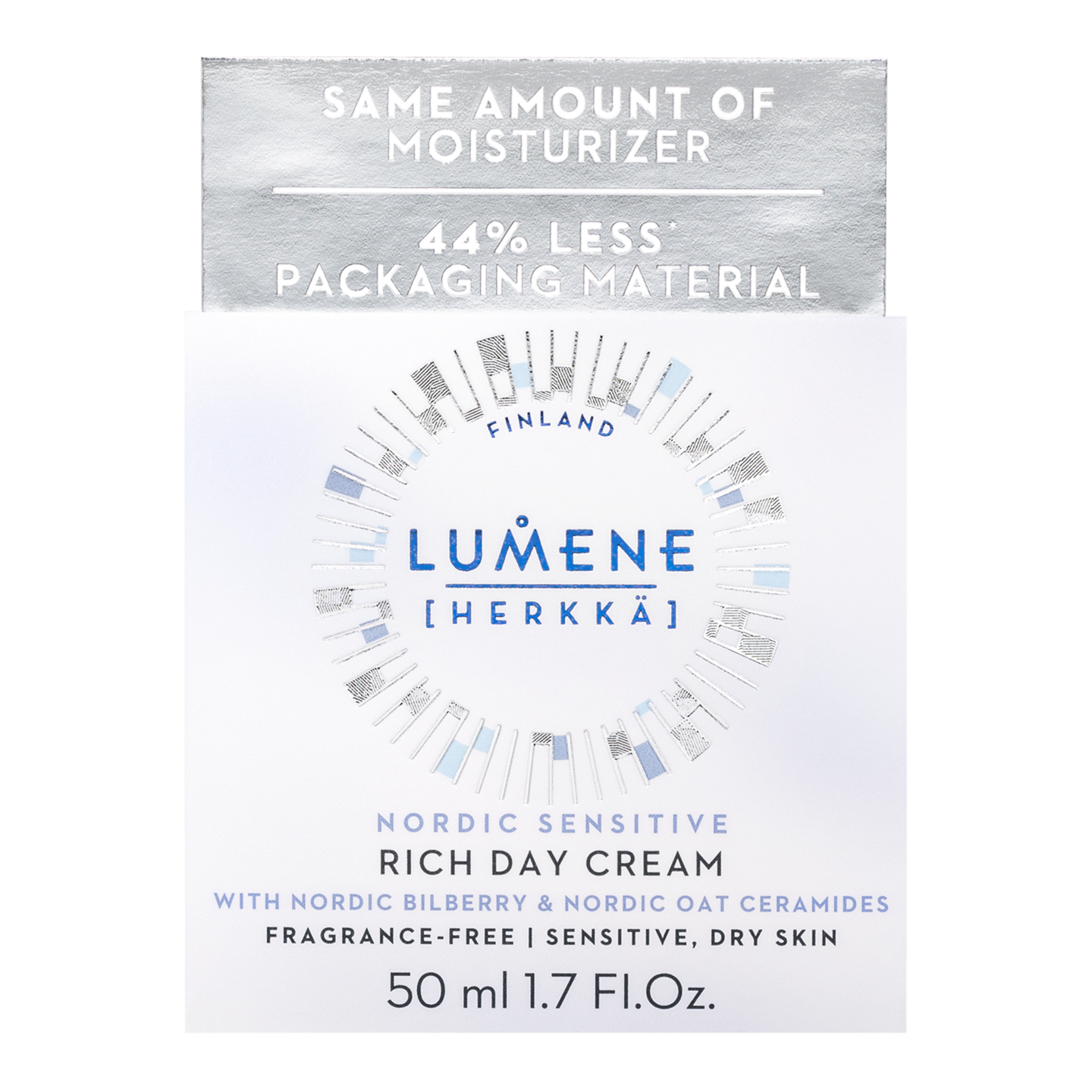 Täyteläinen, hajusteeton päivävoide rauhoittaa herkkää ihoa välittömästi ja vahvistaa vahingoittunutta ihon suojakerrosta. Kliinisesti testattu herkällä iholla. Kehitetty yhteistyössä Astma-, iho- ja allergialiiton kanssa. LUMENE Nordic Sensitive [Herkkä] Rauhoittava & ravitseva päivävoide on keramideilla tehostettu kosteusvoide herkälle ja kuivalle iholle. Hyödyntämällä ihon suojakerrosta tukevaa pohjoista kaurakeramidia ja rauhoittavaa mustikan siemenöljyä, tämä hoitava koostumus rauhoittaa ihoa välittömästi, kosteuttaa tehokkaasti ja vahvistaa ihon suojakerrosta saaden ihon näyttämään hyvinvoivalta ja tuntumaan rauhoittuneelta. KLIINISESTI TESTATTU: Vahvistaa ihon suojakerrosta* Vegaaninen koostumus sisältää sivuvirroista saatavia ja luonnosta käsin poimittuja raaka-aineita. Valmistettu Suomessa. Uutta! Ympäristövaikutusten vähentämiseksi** tämä kosteusvoide on nyt pakattu kevyempään ja kompaktimpaan, biopohjaisesta muovista valmistettuun 50ml purkkiin. Sama määrä suosikkikosteusvoidettasi – 44% vähemmän pakkausmateriaalia verrattuna edelliseen 50ml Lumene-kosteusvoidepurkkiin. Purkki on kierrätettävä ja se lajitellaan muovinkeräykseen. *Kliininen testi, n=27, 4 viikon käyttö. **ISO 14040:2006 ja ISO 14044:2006 standardien mukainen kolmannen osapuolen varmentama elinkaariarviointi (cradle-to-grave). Lisätietoa: kts pakkauksen QR-koodi.
