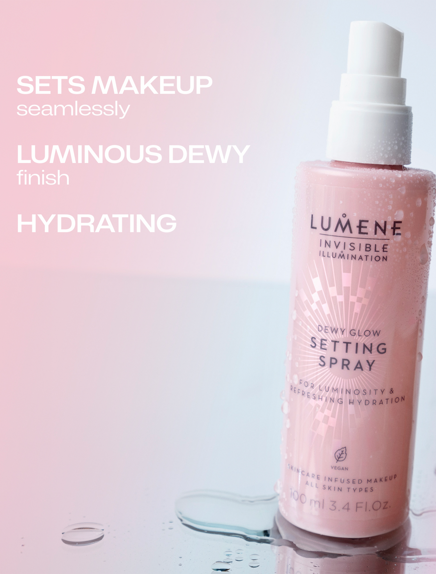 Invisible Illumination Dewy Glow Kosteuttava meikinkiinnityssuihke kiinnittää meikin pitkäkestoisesti ja antaa iholle kasteenraikkaan hehkun.