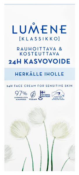 Klassikko Rauhoittava & kosteuttava 24h kasvovoide antaa pitkäkestoista 24h kosteutusta ja rauhoittaa herkkää ihoa. Ainutlaatuinen yhdistelmä, joka sisältää pohjoista tupasvillaa, puhdasta pohjoista lähdevettä ja ihoa rauhoittavia raaka-aineita kosteuttaa ja hellii herkkää ihoa jättäen sen pehmeän ja tasapainoisen näköiseksi. . Hajusteeton ja sopii herkälle iholle. Levitä voidetta puhtaalle kasvojen ja kaulan iholle. Kehitetty yhteistyössä allergia-, iho- ja astmaliiton kanssa.