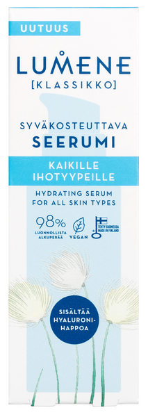 LUMENE Klassikko Syväkosteuttava seerumi kosteuttaa ihanteellisesti ja auttaa täydentämään ihon kosteustasoa saaden sen näyttämään sileämmältä ja kauniin hyvinvoivalta. Kosteuttavaa pohjoista tupasvillaa, täyteläistävää hyaluronihappoa ja puhdasta pohjoista lähdevettä sisältävä kevyt seerumi imeytyy nopeasti ja jättää ihon raikkaaksi ja pehmeäksi. Vegaaninen koostumus sopii kaikille ihotyypeille, ja sisältää sivuvirroista saatavia ja pohjoisen luonnosta peräisin olevia raaka-aineita. Pakkauksessa on käytetty kierrätettäviä ja kierrätettyjä materiaaleja. Valmistettu Suomessa.