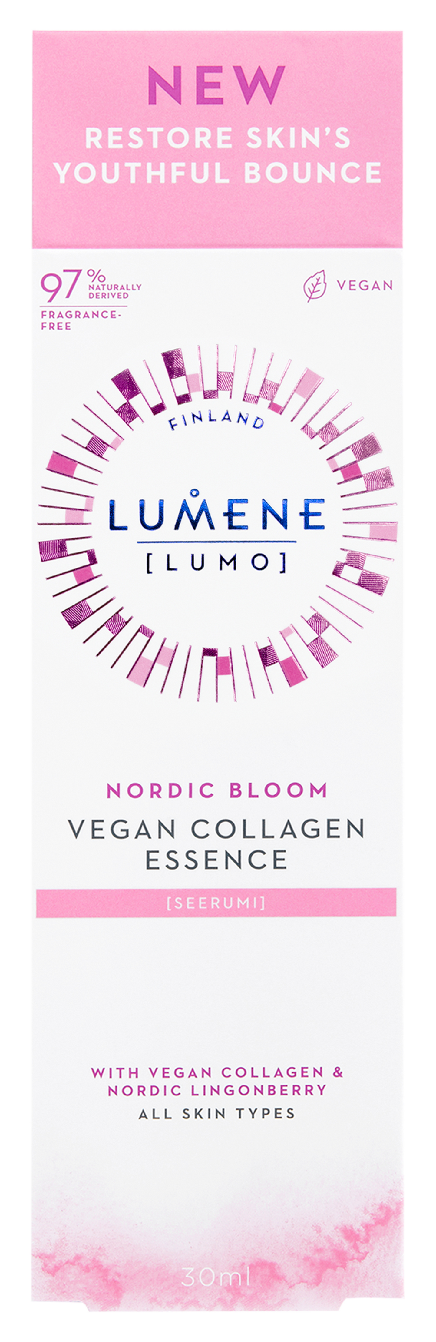 • Kimmoisuutta lisäävä seerumi, joka näkyvästi vähentää ryppyjen ulkonäköä ja kosteuttaa intensiivisesti • Sisältää vegaanista kollageenia, kolminkertaista hyaluronihappoa ja pohjoista puolukkaa • Hajusteeton, sopii kaikille ihotyypeille Palauta ihosi nuorekas kimmoisuus silottavalla suosikkiseerumilla. LUMENE Nordic Bloom [Lumo] Kimmoisuutta lisäävä kollageeniseerumi häivyttää ihon kollageenin vähenemisen merkkejä ja kliinisesti testatusti* häivyttää näkyvästi ryppyjä ja auttaa tekemään ihosta elastisemman näköisen. Iho näyttää kiinteämmältä ja nuorekkaammalta. Itsearviointitutkimuksessa 2 kuukauden jälkeen**: 100% mielestä iho näyttää sileämmältä 97% mielestä häivyttää hienoja juonteita ja ryppyjä 97% mielestä iho näyttää kimmoisalta 100% ostaisi tuotteen ja suosittelisi sitä ystävälleen *Kliininen testi, n=30-33. Käyttö 2 krt/päivä. Tulokset paranevat jatkuvassa käytössä. **Itsearviointi 2 kuukauden käytön jälkeen, n=33, 2022. Käyttöohjeet: Levitä puhtaalle iholle ennen kosteusvoidetta. Vieläkin tehokkaampia tuloksia saadaksesi käytä ennen seerumia ja kosteusvoidetta. Vegaaninen koostumus sisältää sivuvirroista saatavia raaka-aineita. Pakkaus on tehty kierrätetyistä sekä kierrätettävistä materiaaleista. Valmistettu Suomessa.