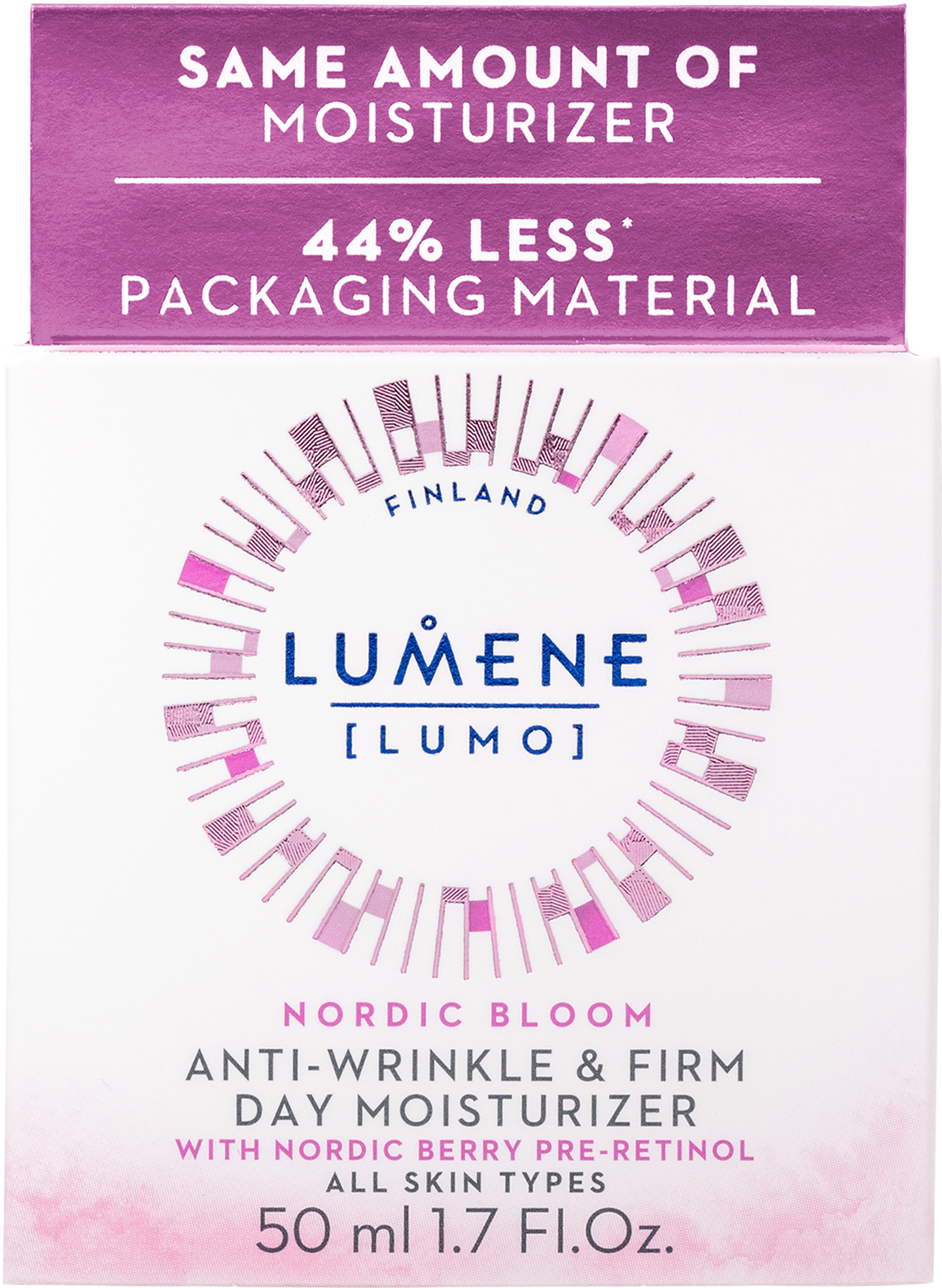 • Kosteuttava päivävoide, joka saa ihon näyttämään sileämmältä ja kiinteämmältä • Koostumus sisältää pohjoisten marjojen pre-retinolia sekä patentoitua pohjoista puolukkauutetta • Nopeasti imeytyvä koostumus kaikille ikääntyville ihotyypeille LUMENE Nordic Bloom [Lumo] Silottava & kiinteyttävä päivävoide kliinisesti testatusti* auttaa vähentämään näkyvästi ryppyjä ja juonteita. Saa ihon näyttämään kiinteämmältä ja kimmoisammalta jatkuvassa käytössä. Nopeasti imeytyvä, hyvin meikin alle soveltuva koostumus. Itsearviointitutkimuksessa 2 kuukauden käytön jälkeen**: 93% mielestä ihon juonteet ja rypyt ovat vähentyneet 96% mielestä iho tuntuu kiinteämmältä ja kimmoisammalta. 97% mielestä iho tuntuu täyteläisemmältä. 96% mielestä iho on tasaisempi *Kliininen testi, n= 23-27. Käyttö 2/krt päivä 2 kk ajan. **Itsearviointi, n=27. Käyttö 2/krt päivä 2kk ajan.