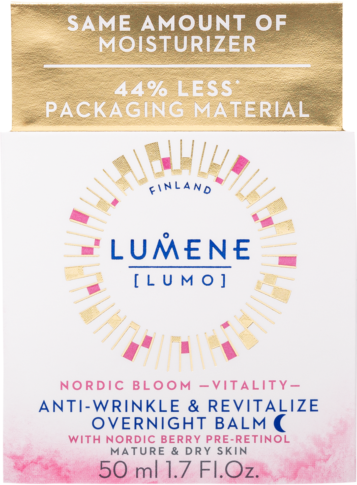 LUMENE Nordic Bloom [Lumo] Vitality Silottava & elvyttävä yövoide ravitsee ikääntynyttä ja kuivaa ihoa yön aikana auttaen häivyttämään edenneitä ikääntymisen merkkejä: ryppyjä, sameutta, kuivuutta ja täyteläisyyden vähentymistä. Täyteläinen, pohjoisten marjojen pre-retinolia ja pohjoista maitohorsmaa sisältävä yövoide auttaa ihoa palautumaan yön aikana saaden sen näyttämään uudistuneelta ja hehkuvalta aamulla. Vegaaninen koostumus sisältää sivuvirroista saatavia ja luonnosta käsin poimittuja raaka-aineita. Valmistettu Suomessa. Uutta! Ympäristövaikutusten vähentämiseksi* tämä kosteusvoide on nyt pakattu kevyempään ja kompaktimpaan, biopohjaisesta muovista valmistettuun 50ml purkkiin. Sama määrä suosikkikosteusvoidettasi – 44% vähemmän pakkausmateriaalia verrattuna edelliseen 50ml Lumene-kosteusvoidepurkkiin. Purkki on kierrätettävä ja se lajitellaan muovinkeräykseen. *ISO 14040:2006 ja ISO 14044:2006 standardien mukainen kolmannen osapuolen varmentama elinkaariarviointi (cradle-to-grave). Lisätietoa: kts pakkauksen QR-koodi.