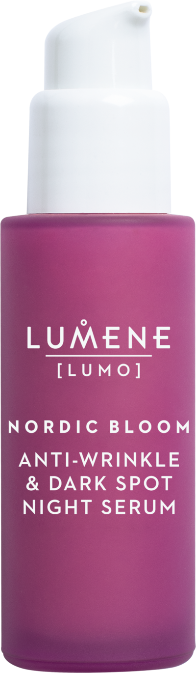 • Silottavan & pigmenttiläiskiä häivyttävän yöseerumin tehokas koostumus auttaa jatkuvassa käytössä näkyvästi vähentämään tummia läikkiä ja ryppyjä • Sisältää pohjoismaista pre-retinolia, gallushappoa ja niasiiniamidia • Hellävarainen seerumi sopii käytettäväksi joka ilta kirkkaamman, tasaisemman ja pehmeämmän ihon saavuttamiseksi LUMENE Nordic Bloom [Lumo] Silottavan & pigmenttiläiskiä häivyttävän yöseerumin tehokas koostumus auttaa jatkuvassa käytössä näkyvästi vähentämään tummia läiskiä ja ryppyjä, tukien samalla ihon yön aikaista uudistumista. Innovatiivinen gallushapon ja niasiiniamidin yhdistelmä auttaa hoitamaan ihonsävyn epätasaisuutta ja pigmenttimuutoksia usealla tasolla. Tulokset yöseerumin 8 viikon käytön jälkeen*: 93 % huomasi hienojen juonteiden ja ryppyjen vähentyneen 86 % huomasi tummien läiskien olevan vähemmän näkyviä 90 % huomasi ihonsävyn olevan tasaisempi 96 % huomasi ihon tuntuvan pehmeämmältä, kimmoisammalta ja sileämmältä *Kuluttajien itsearvio, n=31, 8 viikkoa, yöllinen käyttö. Käyttöohjeet: Levitä iltaisin puhdistetuille kasvoille ja kaulalle, ennen yövoiteen levitystä. Intensiivisemmän kosteutuksen ja kimmoisamman lopputuloksen saavuttamiseksi, käytä yhdessä rakastetun Nordic Bloom [Lumo] Kimmoisuutta lisäävän kollageeniseerumin kanssa; levitä kollageeniseerumi puhdistetulle iholle, lisää yöseerumi ja viimeistele yövoiteella. Seerumin koostumus on vegaaninen ja sisältää kestävästi elintarviketeollisuuden sivuvirroista jalostettuja raaka-aineita. Pakkaus on valmistettu kierrätetyistä ja kierrätettävistä materiaaleista. Valmistettu Suomessa.