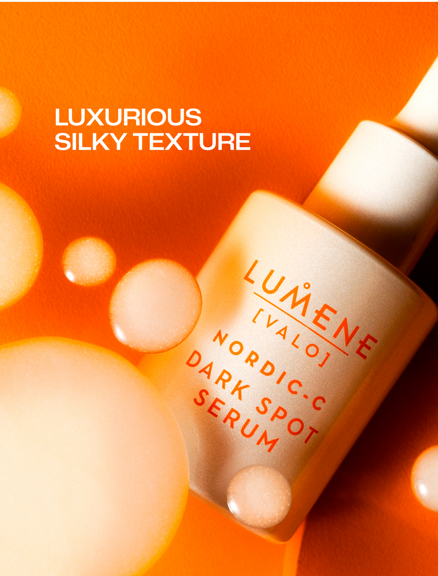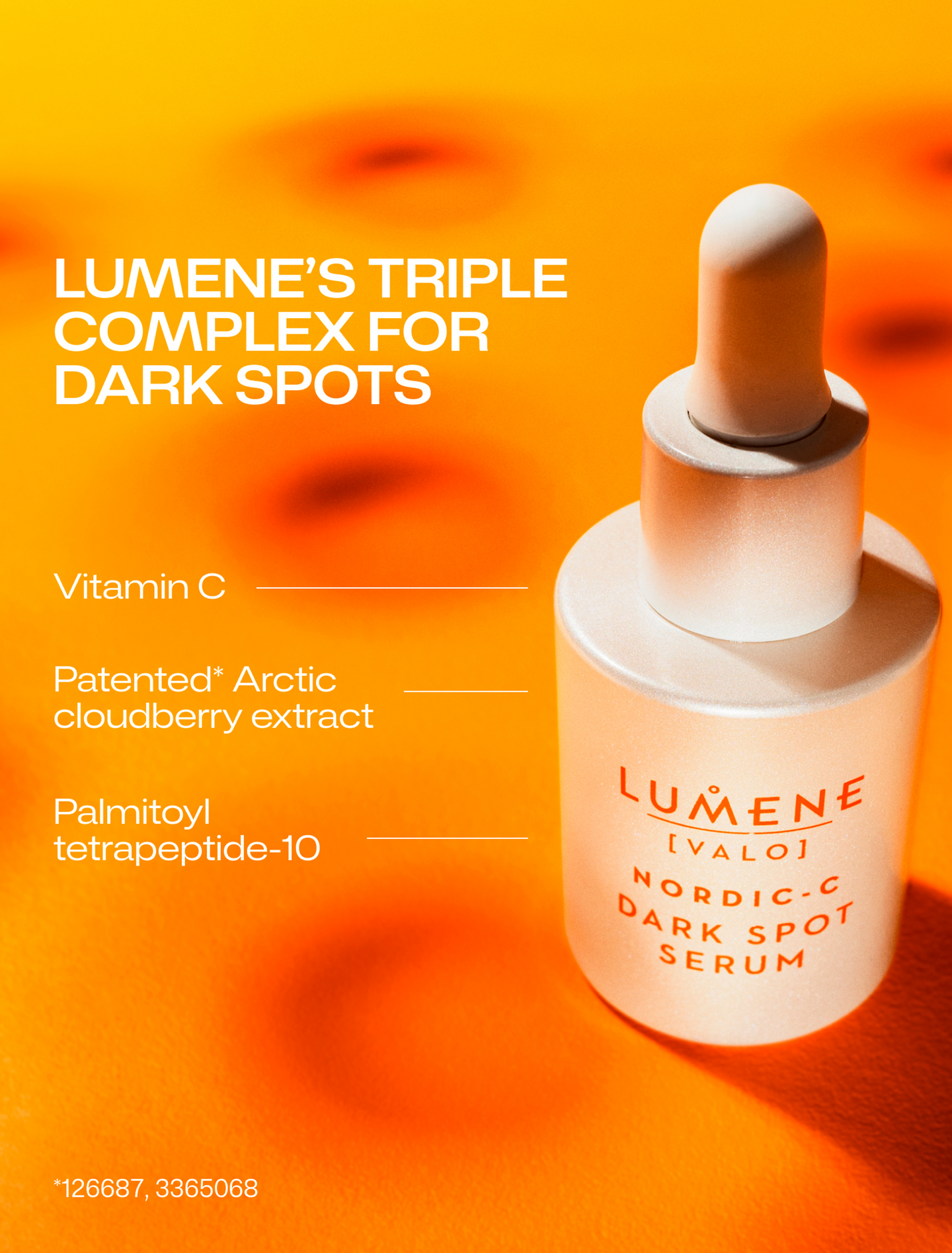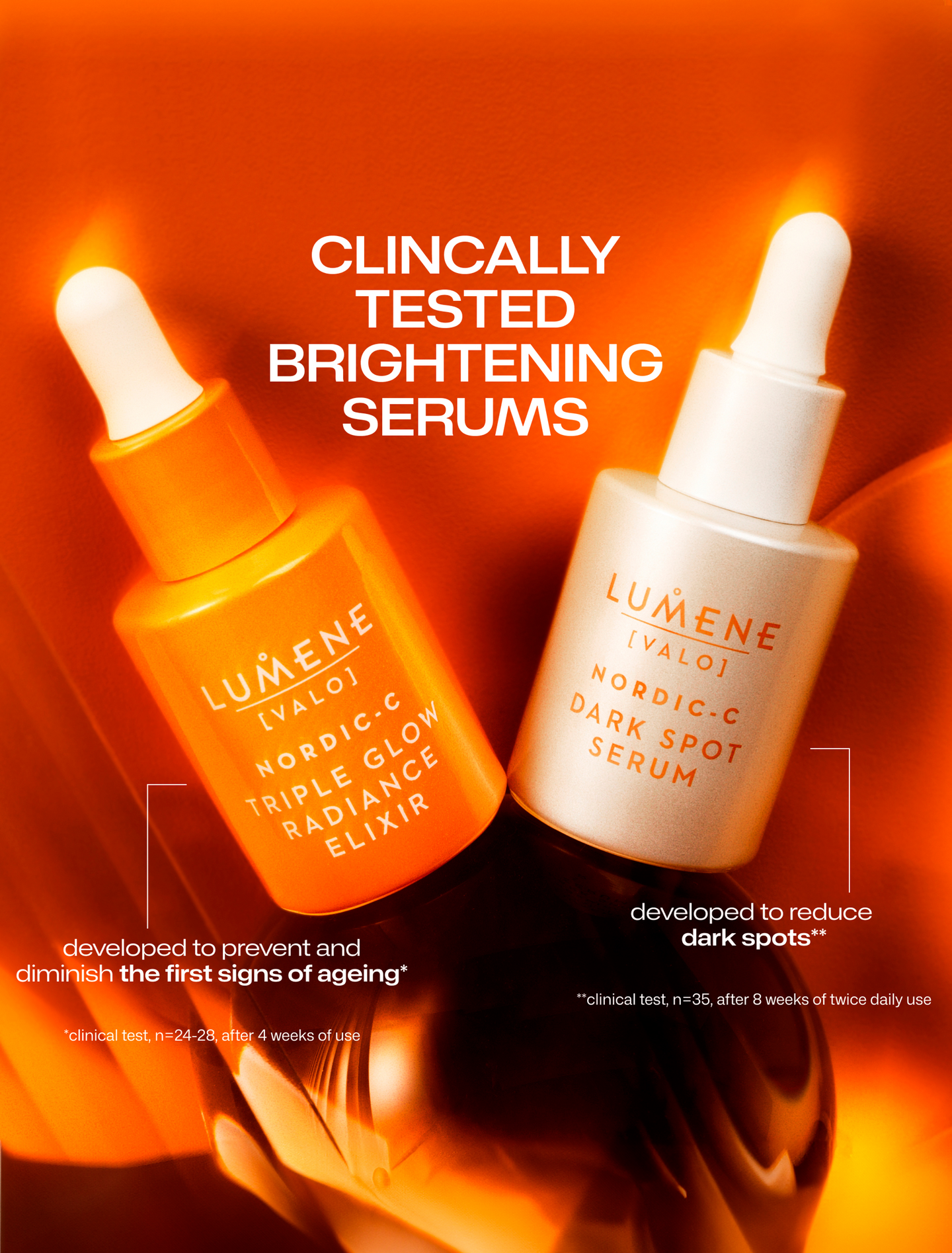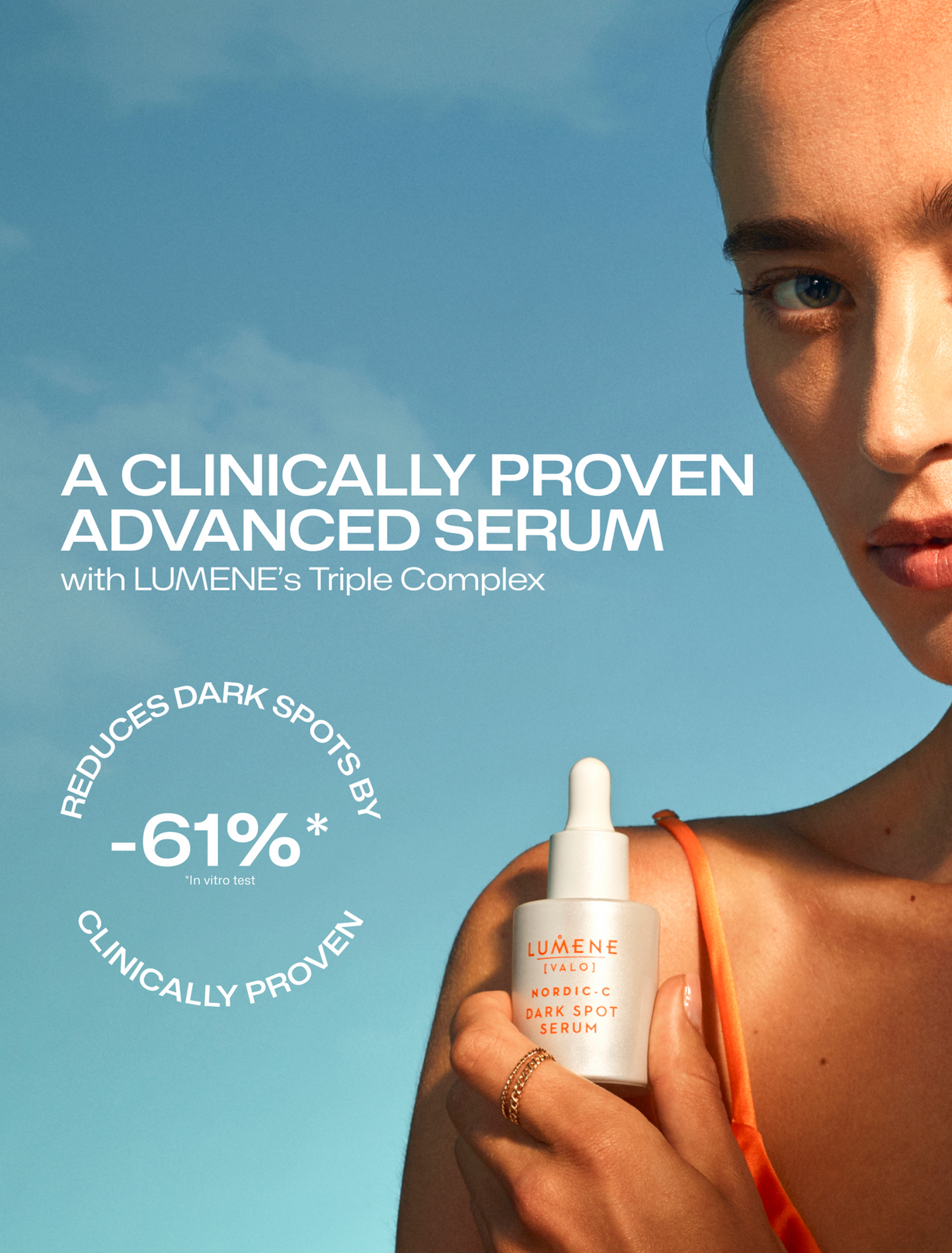 • Kehitetty häivyttämään eri tekijöistä aiheutuvia pigmenttiläiskiä ja ehkäisemään uusien muodostumista. • Tehokas, mutta hellävarainen seerumi auttaa tekemään ihosta tasaisen sävyisen ja näkyvästi kirkkaamman. • LUMENEn ainutlaatuinen Kolminkertainen pigmenttiläiskiä häivyttävä yhdiste, joka sisältää patentoitua* pohjoista lakkajauhetta, C-vitamiinia ja Palmitoyl Tetrapeptide-10 -peptidiä. Vähemmän pigmenttiläiskiä, tasaisen sävyinen ja näkyvästi kirkkaampi iho pohjoisen luonnon ja tieteen viimeisimpien innovaatioiden yhdistelmällä. Uusi LUMENE Nordic-C [Valo] Kirkastava & pigmenttiläiskiä häivyttävä seerumi saa tehonsa LUMENEn ainutlaatuisesta Kolminkertaisesta pigmettiläiskiä häivyttävästä yhdisteestä, joka sisältää pohjoista lakkajauhetta, C-vitamiinia ja Palmitoyl Tetrapeptide 10 -peptidiä. Seerumin tehokas, mutta hellävarainen koostumus häivyttää kaiken tyyppisiä pigmenttiläiskiä ja ehkäisee uusien muodostumista. Iho näyttää säteilevältä, sileältä ja nuorekkaan hehkuvalta. Kliinisesti todistettu: vähentää tummia läiskiä -61%** Itsearviointitutkimuksessa*** 91% mielestä tummat läiskät vaalenivat 94% mielestä iho on hehkuvampi 94% mielestä ihon sävy on tasaisempi 100% mielestä iho tuntuu kosteutetulta, kimmoisalta ja pehmeältä *126687, 3365068 **In vitro -testi ***Itsearviointi, n=35, käyttö kaksi kertaa päivässä Seerumi on vegaaninen ja sisältää sivuvirroista saatavia ja pohjoisen luonnosta peräisin olevia raaka-aineita. Pakkauksessa on käytetty kierrätettyjä ja kierrätettäviä materiaaleja. Tehty Suomessa. Käyttö: Levitä puhdistetulle kasvojen ja kaulan iholle. Parhaan tuloksen saadaksesi käytä yhdessä kosteusvoiteen kanssa.