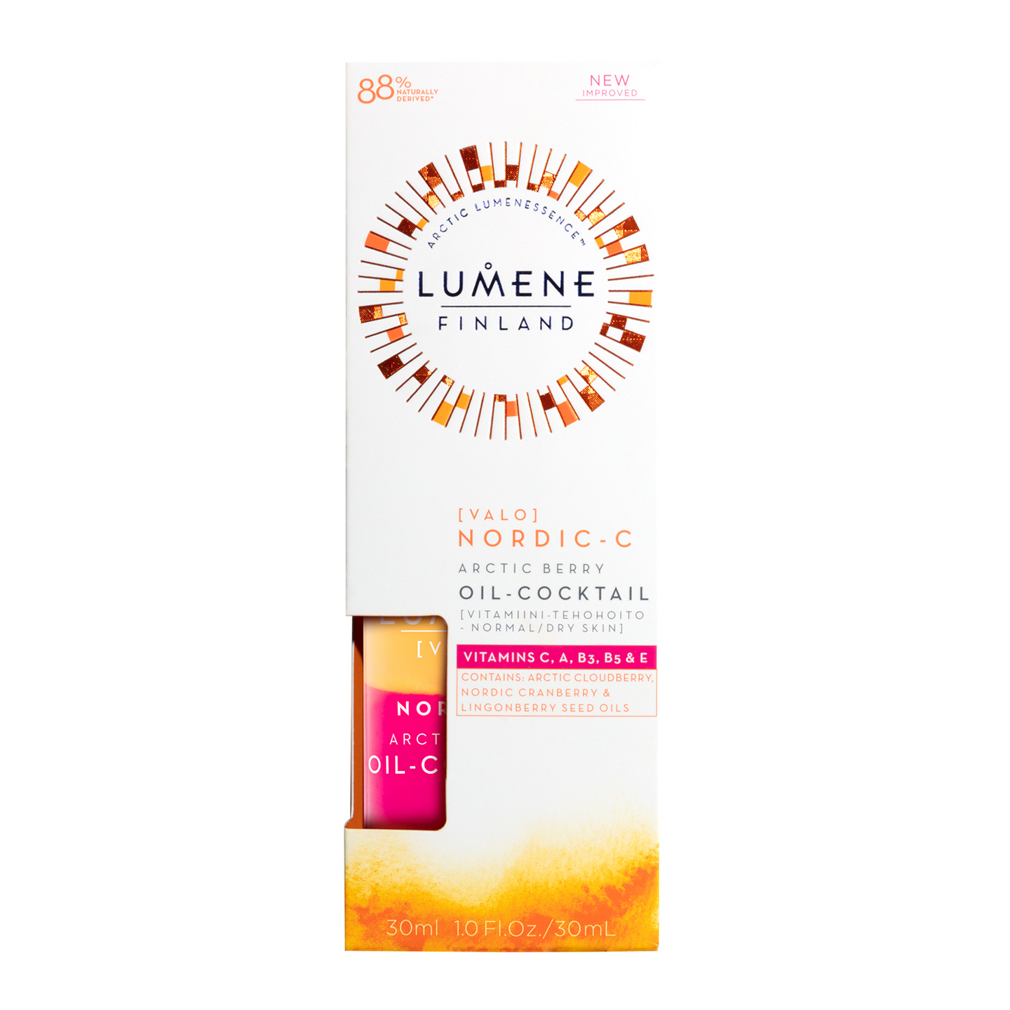 Palauta ihon hehku LUMENE Nordic-C [Valo] Ravitsevalla vitamiini-tehohoidolla. Seerumin ainutlaatuinen kaksiosainen koostumus yhdistää antioksidanttipitoiset tärkeitä omega-rasvahappoja sisältävät kallisarvoiset pohjoisen marjat – lakan, karpalon ja puolukan – yhdistelmään C-, B3-, B5- ja E-vitamiineja sekä A-vitamiinin esiastetta. Hoitava koostumus auttaa elvyttämään ja tasoittamaan kuivintakin ihoa sekä suojaamaan sen kauneutta. Jättää ihon tehokkaasti kosteutetuksi, heleäksi ja samettisen pehmeäksi. Vegaaninen koostumus sisältää sivuvirroista saatavia ja luonnosta käsin poimittuja raaka-aineita. Pakkauksessa on käytetty kierrätettäviä ja kierrätettyjä materiaaleja. Käyttö: Ravistettava ennen käyttöä. Levitä puhtaalle kasvojen ja kaulan iholle. Käytä yhdessä VALO-kosteusvoiteen kanssa. LUMENE - Korkealaatuista pohjoista kauneutta paremman tulevaisuuden puolesta.