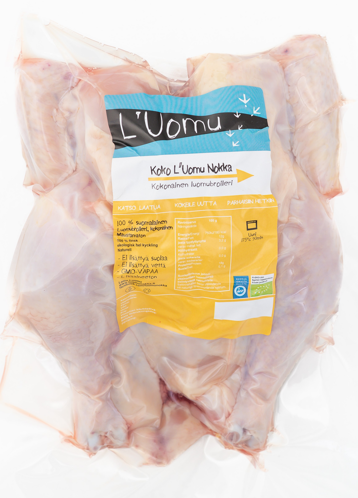 Koko L’Uomu Nokka 100 % suomalainen kokonainen luomubroileri, n. 1,8kg. Siihen ei ole lisätty suolaa eikä vettä ja se on GMO-vapaa sekä lisäaineeton. Yksittäisen tuotteen keskimääräinen paino on 1 500 g.
