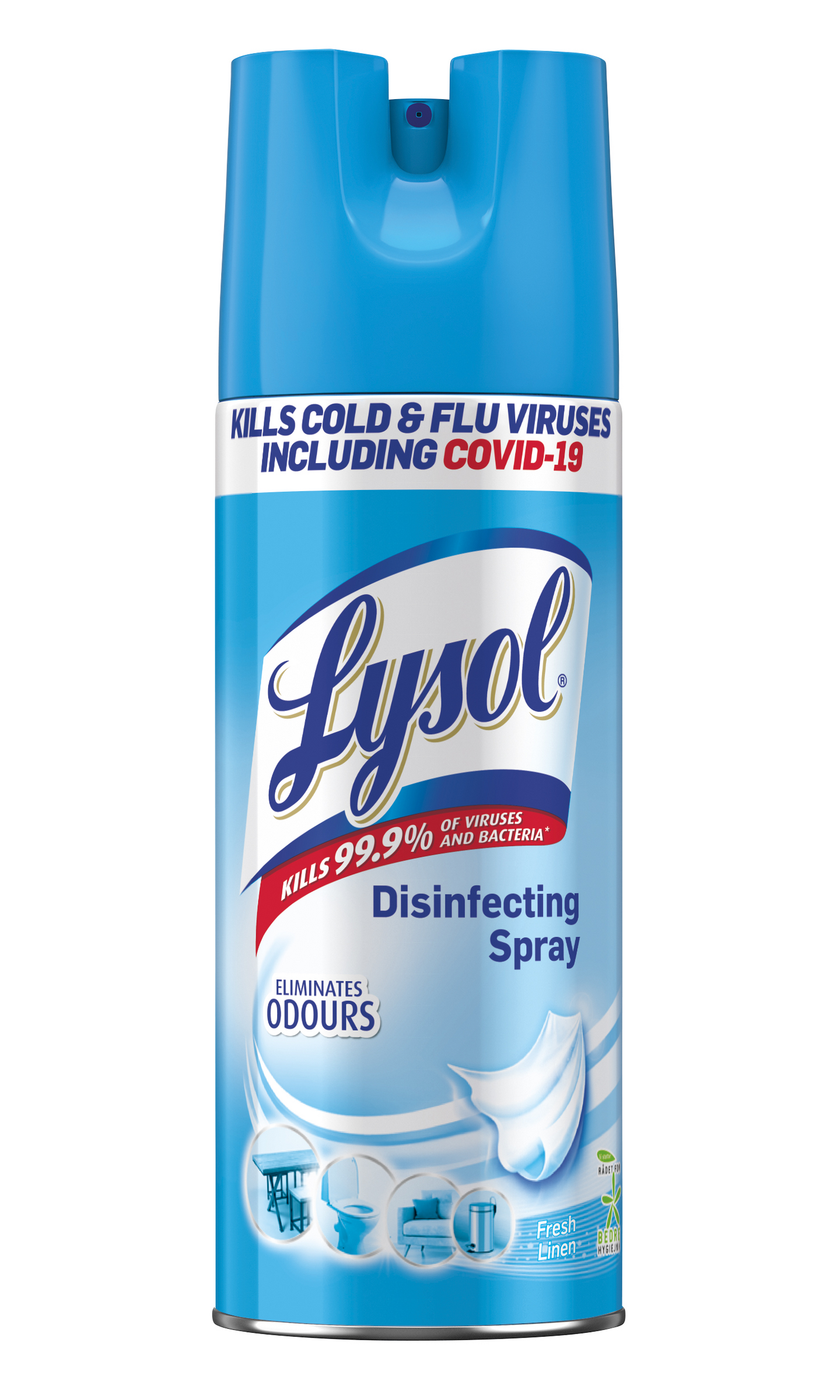 Lysol desinfiointispray auttaa suojelemaan sinua ja perhettäsi, sillä se tappaa 99,9 % bakteereista ja viruksista, mm. COVID-19-viruksen*. Nopea, helppo ja tehokas: Lysol toimii tehokkaasti bakteereihin ja viruksiin heti ensimmäisestä kontaktista alkaen. • Tappamalla bakteereita tuote neutraloi hajuja sekä jättää jälkeensä raikkaan puhtaiden lakanoiden tuoksun. • Lysol Desinfiointispray sopii sadoille erilaisille pinnoille. Se sopii koville pinnoille, kuten ovenkahvoille, keittiön tasoille, roska-astioille, pesualtaille sekä wc-tiloihin, mutta myös pehmeille pinnoille, kuten sohville, kengille sekä kengänpohjille. *Tappaa 99,9 % bakteereista, esim. kolibakteerin, sekä viruksista, esim. influenssa- (H1N1) ja SARS-Cov-2-viruksen (COVID-19).