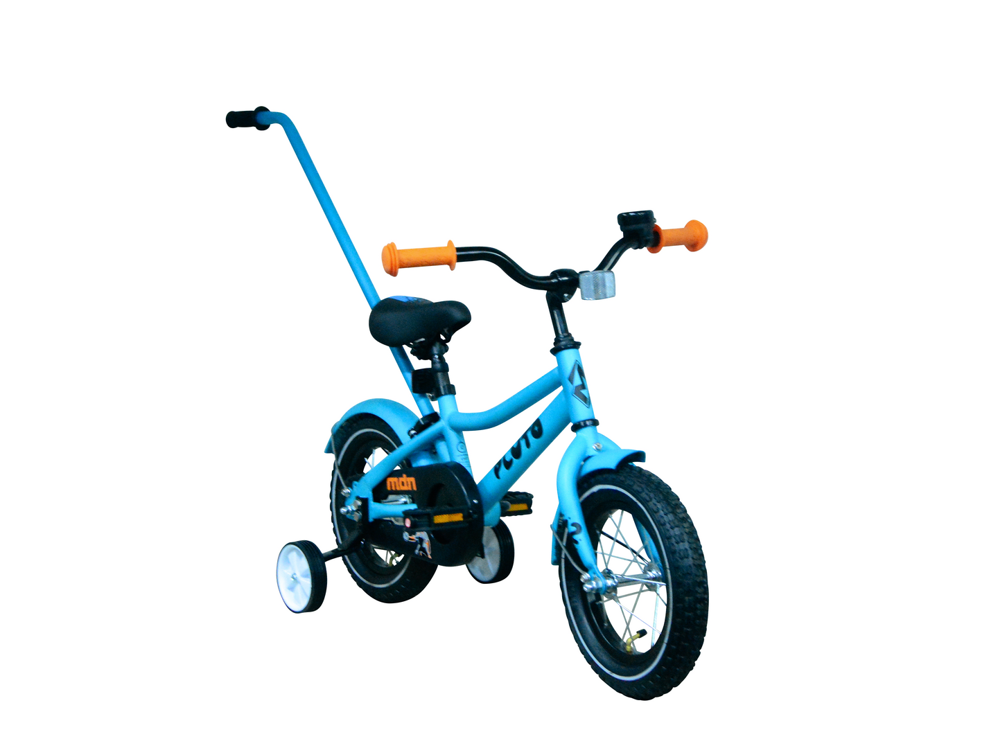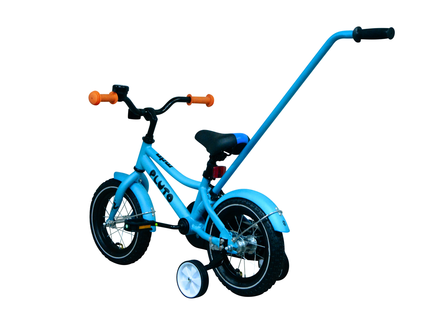 Plutossa on lokasuojat, työntötanko, apupyörät, soittokello ja heijastimet vakiovarusteena.