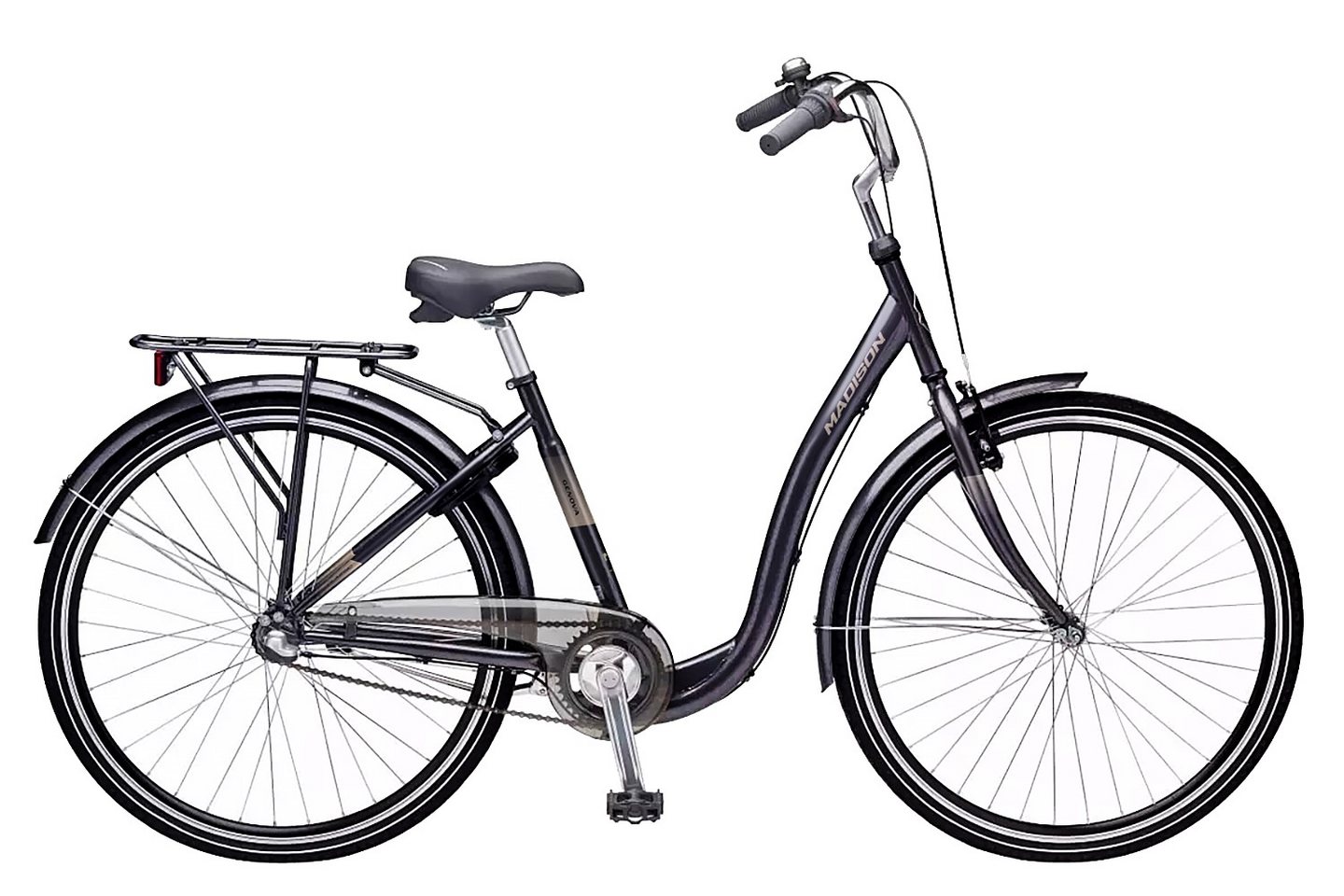 Pyörässä on lokasuojat, tavarateline, runkolukko, seisontatuki, soittokello ja heijastimet vakiovarusteena.