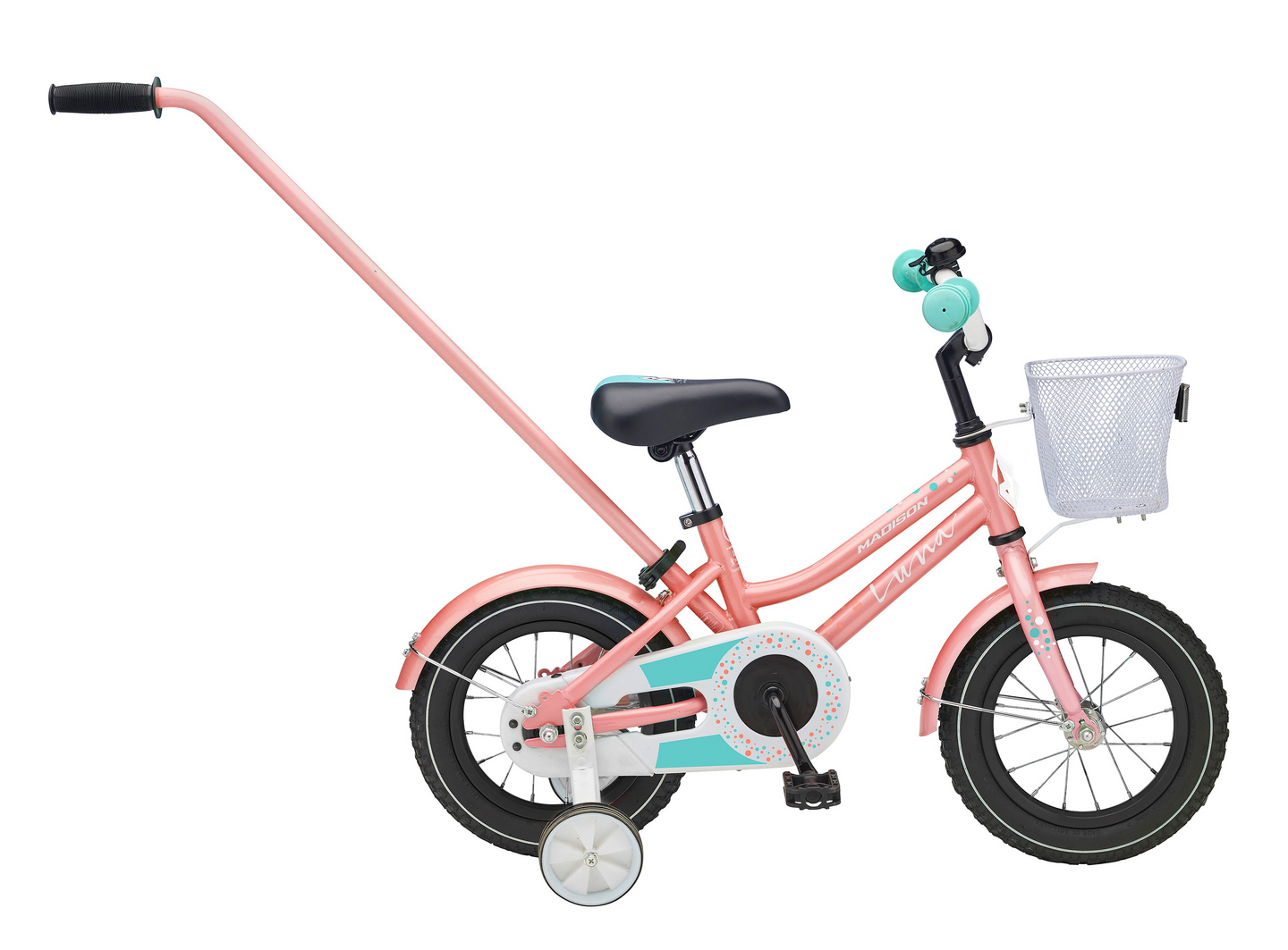 Pikalukitteinen työntötanko helpottaa ajoharjoittelun aloittamista ja etukorissa matkaavat lapsen lelut sekä muut tärkeät pikkuasiat.