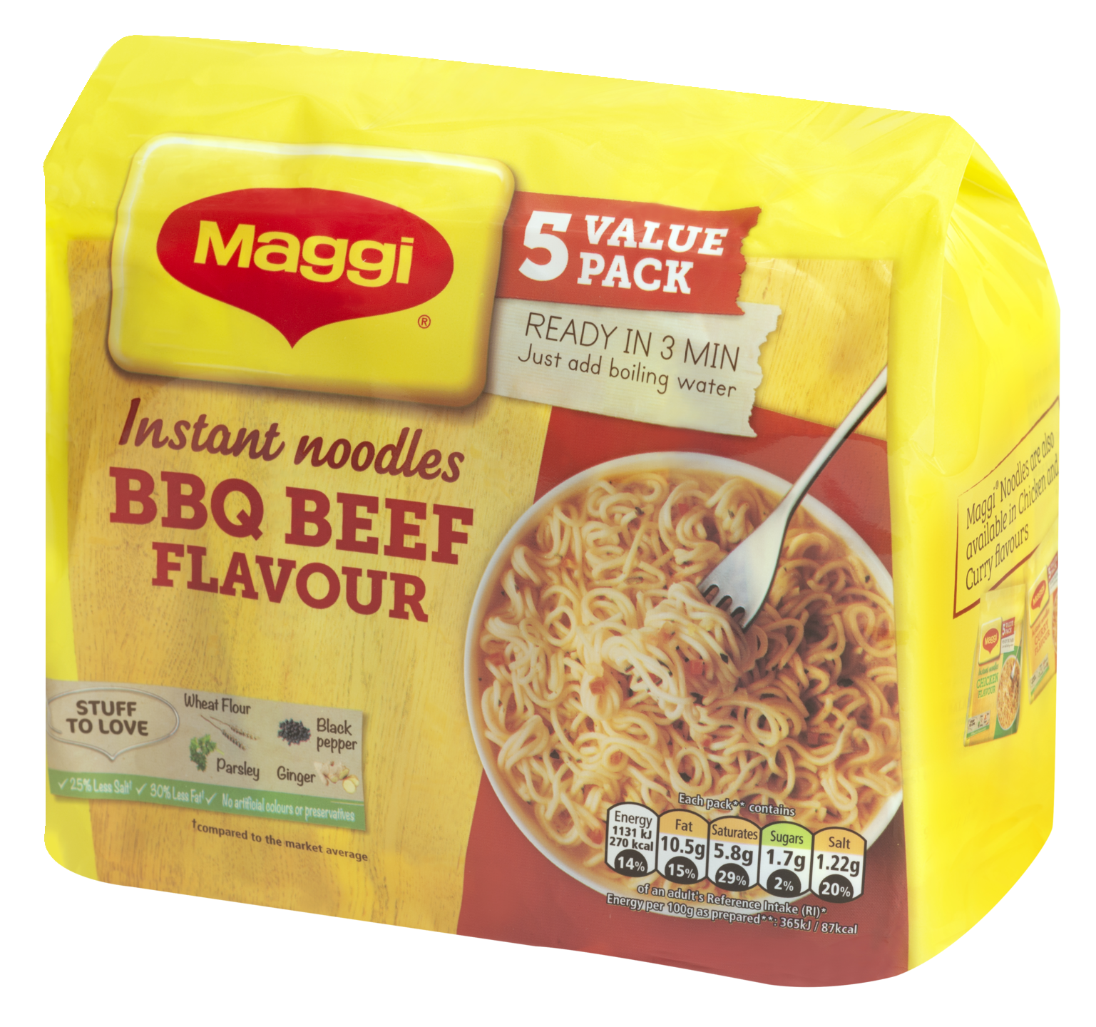 Todella maukasta ja superkätevää – Maggi 3 Minute Noodles -aterialle löytyy aina aikaa! Nämä ikoniset Maggi-nuudelit ovat sitä, mitä lupaavatkin: nauti siis maukkaista, naudanlihan makuisista nuudeleista vain kolmessa minuutissa! Nämä nuudelit eivät ole vain nopeita valmistaa, vaan myös herkullisia. Mikset kokeilisi herkullisia pikanuudeleitamme wokkivihannesten ja vähärasvaisen naudanlihan kanssa? Jokainen Maggi 3 Minute Noodles -ateria on erittäin monikäyttöinen ja helppo valmistaa joko kattilassa tai mikroaaltouunissa. Aloita laittamalla Maggi-nuudelit kulhoon ja tyhjentämällä BBQ-nauta-maustepussi nuudelien päälle. Jos käytät kattilaa, keitä vesi ja kaada 250 ml kiehuvaa vettä nuudelien päälle. Peitä kulho ja anna nuudelien hautua 3 minuutin ajan. Jos käytä mikroaaltouunia, kaada 250 ml kylmää vettä nuudelien päälle ja lämmitä täydellä teholla 2,5 minuutin ajan. Niin helppoa se on!