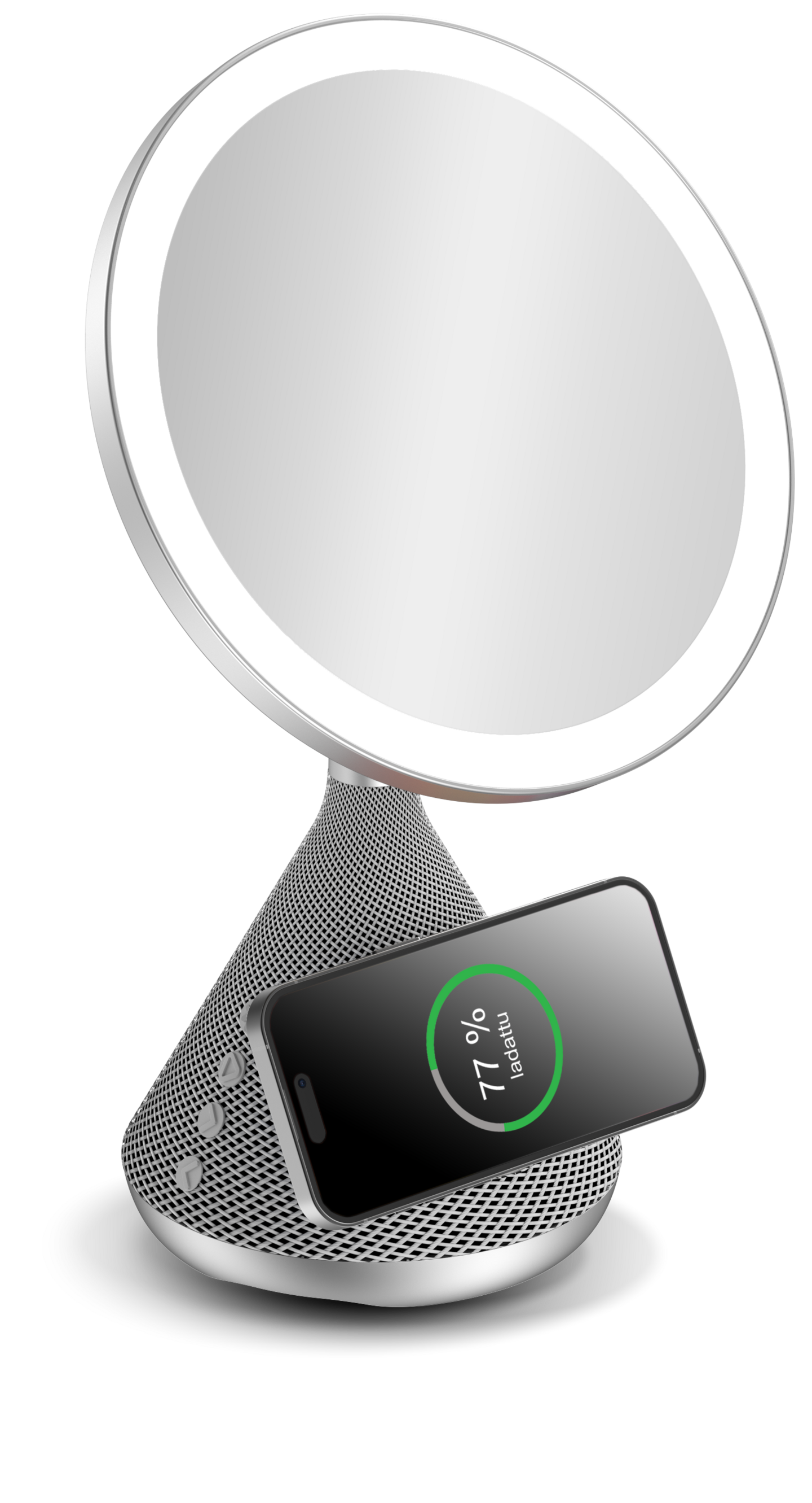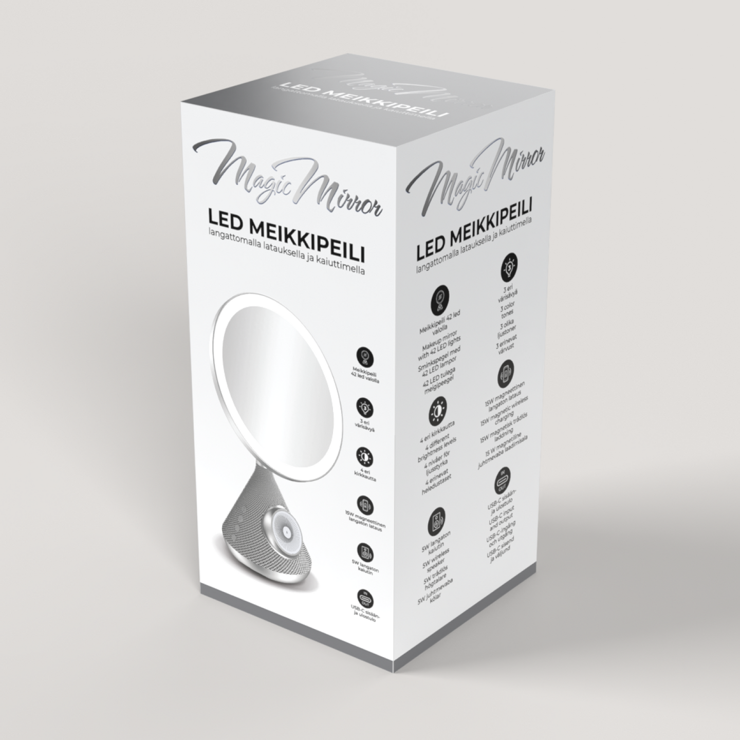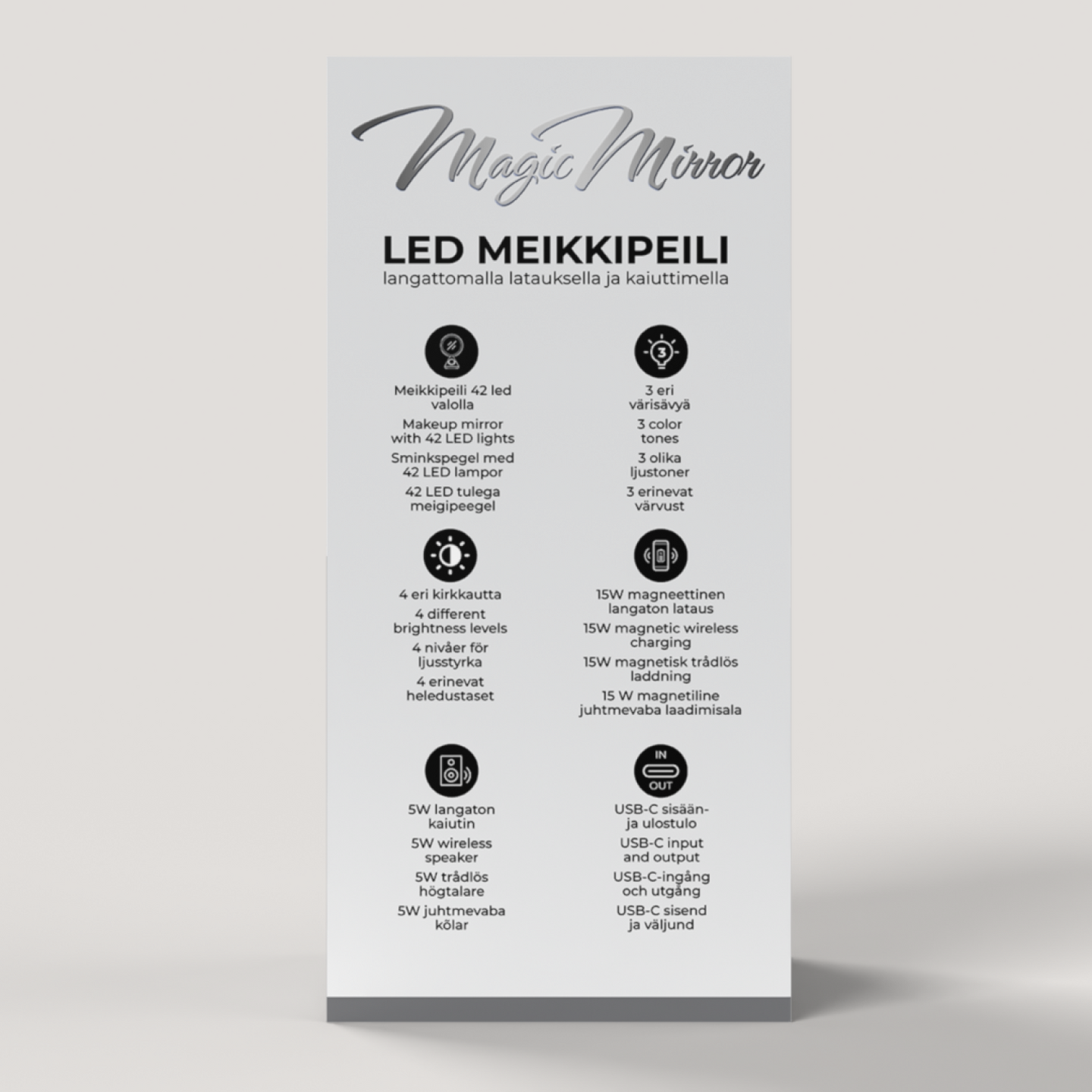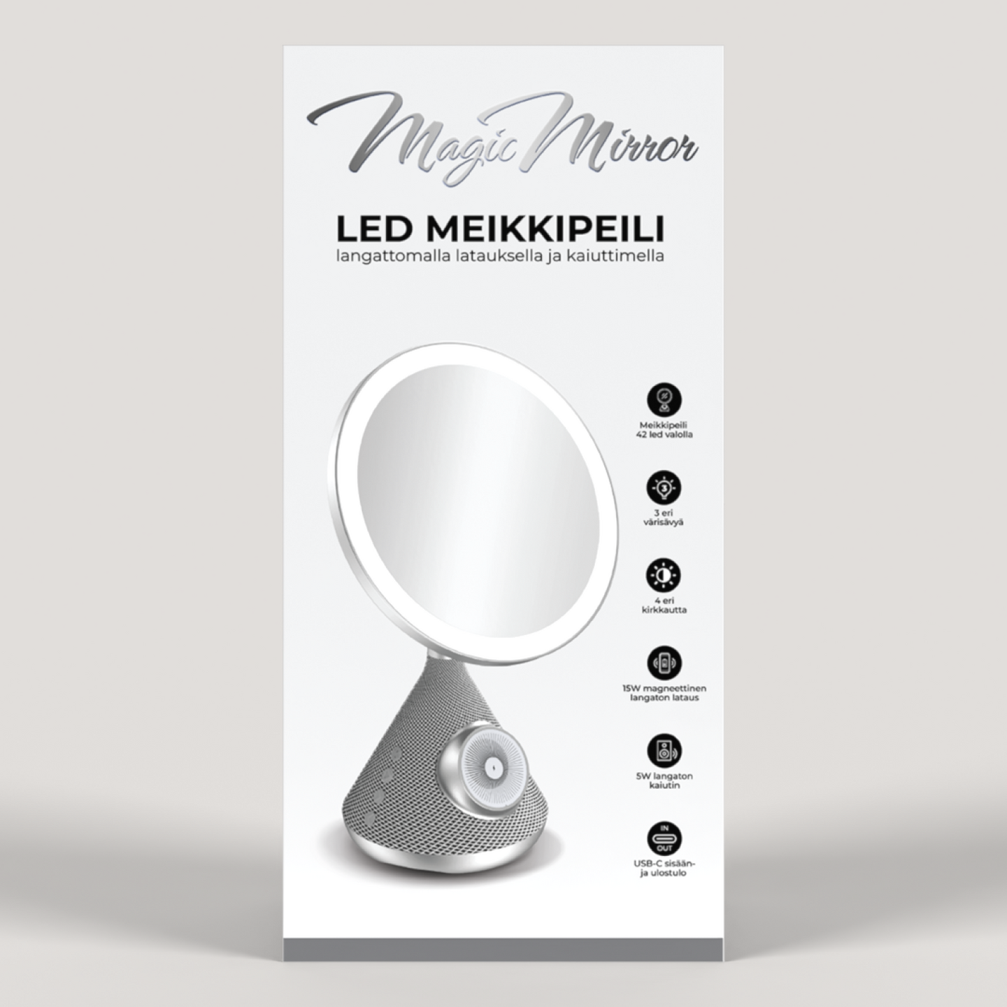 Magic Mirror on 42 LED valolla varustettu meikkipeili, jossa on 3 eri värisävyä (lämmin, luonnollinen, kylmä), 4 eri kirkkaudensäätöä (pois, matala, keski, täysi kirkkaus), sekä 90º asteen säädettävä kallistus. Peilissä on myös 5 W langaton kaiutin, jotta voit meikatessa kuunnella suosikkimusaasi tai vaikka äänikirjaa tai podcastia. Lisäksi laitteessa on myös 15W magneettinen langaton lataus, eli jos puhelimesi tukee tätä toimintoa, niin voit vaikka samalla katsella meikkausvinkkejä vaikkapa TikTokista tai YouTubesta! Laite toimii mukana tulevalla 2 m USB-C-kaapelilla (laturi ostetteva erikseen) ja peilin takana on myös USB-C-ulostulo, eli voit ladata samalla myös sellaista puhelinta tai laitetta, joka ei tue langatonta lataamista. Takuu 2 vuotta.
