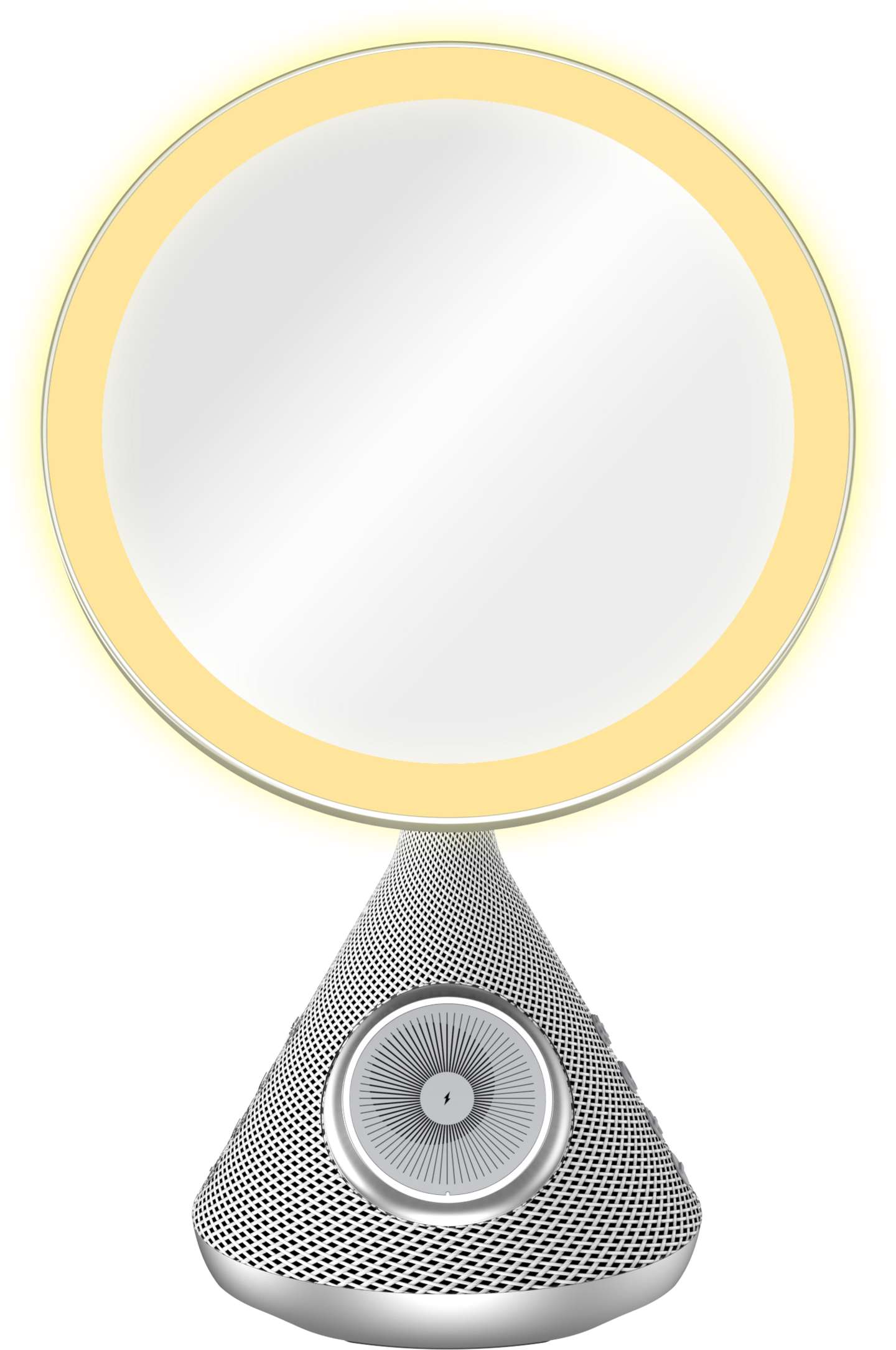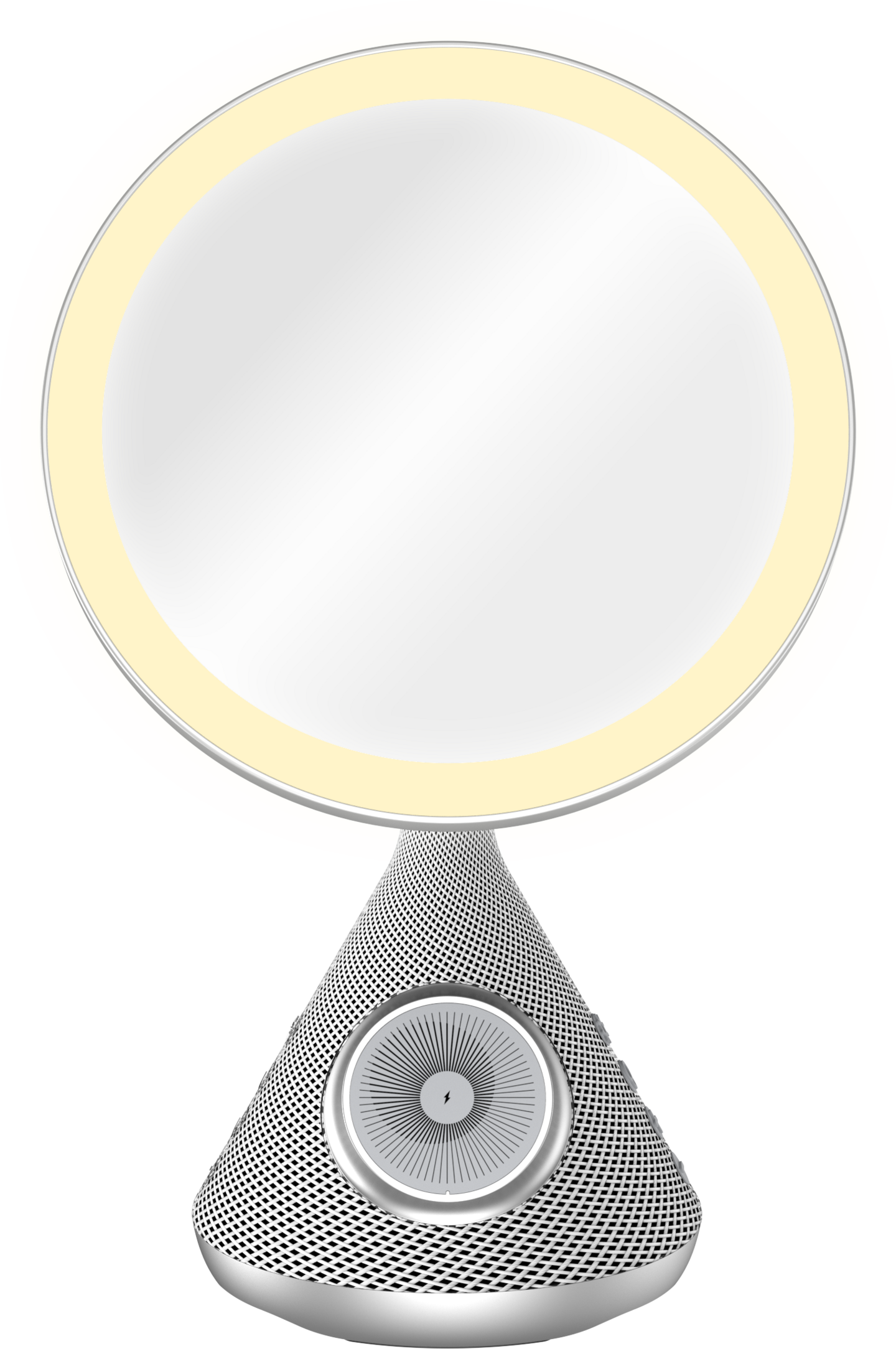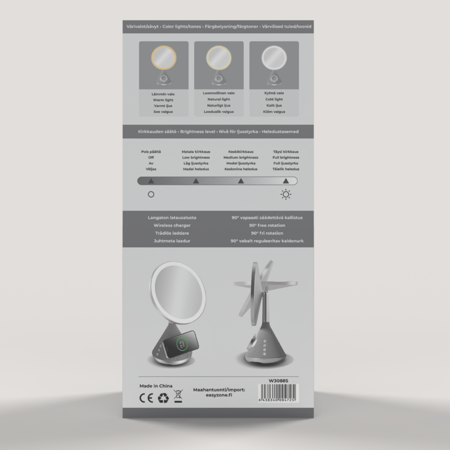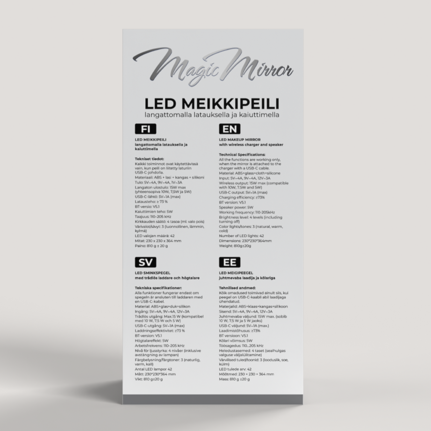 Magic Mirror on 42 LED valolla varustettu meikkipeili, jossa on 3 eri värisävyä (lämmin, luonnollinen, kylmä), 4 eri kirkkaudensäätöä (pois, matala, keski, täysi kirkkaus), sekä 90º asteen säädettävä kallistus. Peilissä on myös 5 W langaton kaiutin, jotta voit meikatessa kuunnella suosikkimusaasi tai vaikka äänikirjaa tai podcastia. Lisäksi laitteessa on myös 15W magneettinen langaton lataus, eli jos puhelimesi tukee tätä toimintoa, niin voit vaikka samalla katsella meikkausvinkkejä vaikkapa TikTokista tai YouTubesta! Laite toimii mukana tulevalla 2 m USB-C-kaapelilla (laturi ostetteva erikseen) ja peilin takana on myös USB-C-ulostulo, eli voit ladata samalla myös sellaista puhelinta tai laitetta, joka ei tue langatonta lataamista. Takuu 2 vuotta.