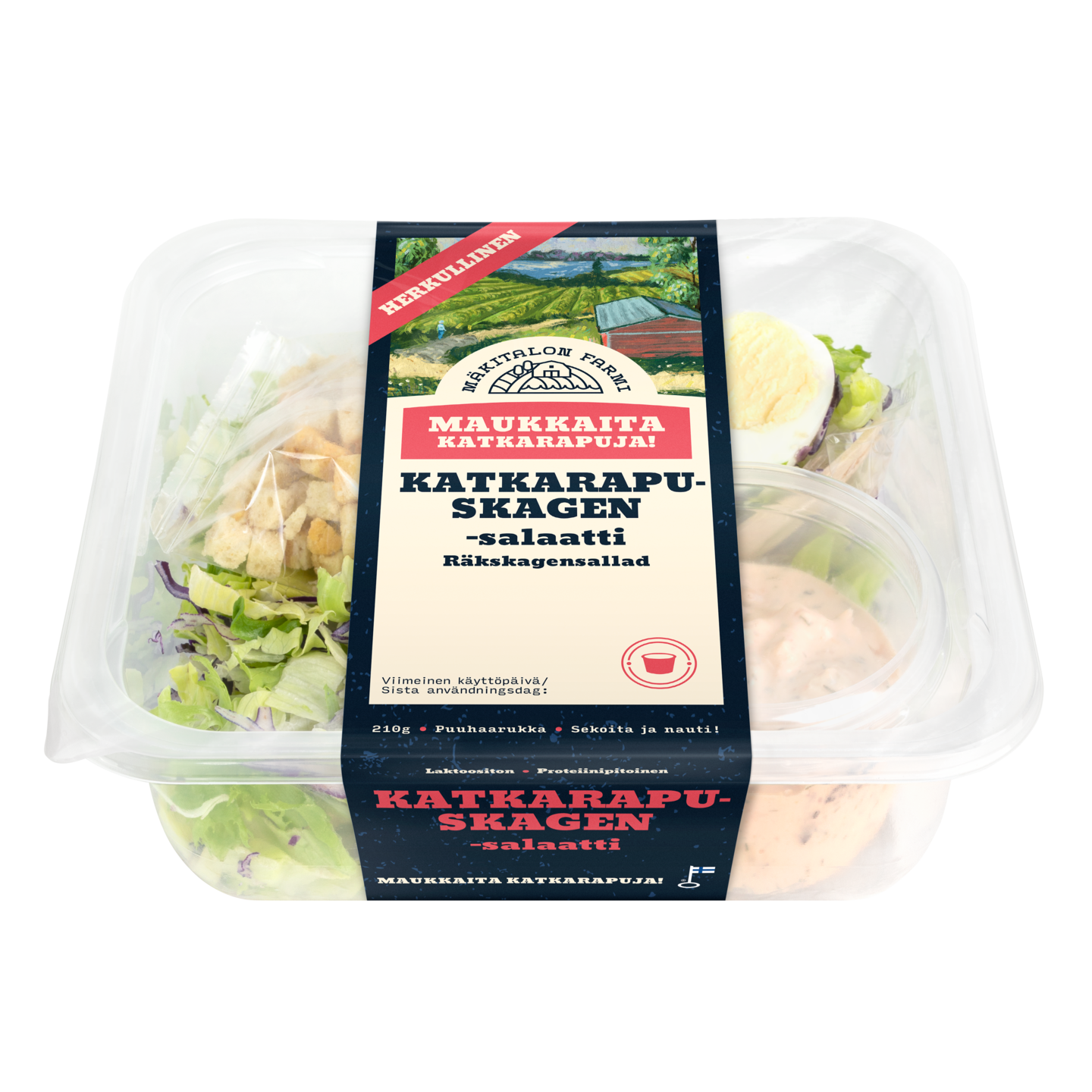Mäkitalon Farmin maukas uutuus sisältää katkarapuskagenia, kananmunaa ja vehnäkrutongit rapealla salaattipedillä. Skagen levittyy salaattiin tasaisesti ja tekee joka suupalasta herkullisen - erillistä kastiketta ei tarvita.