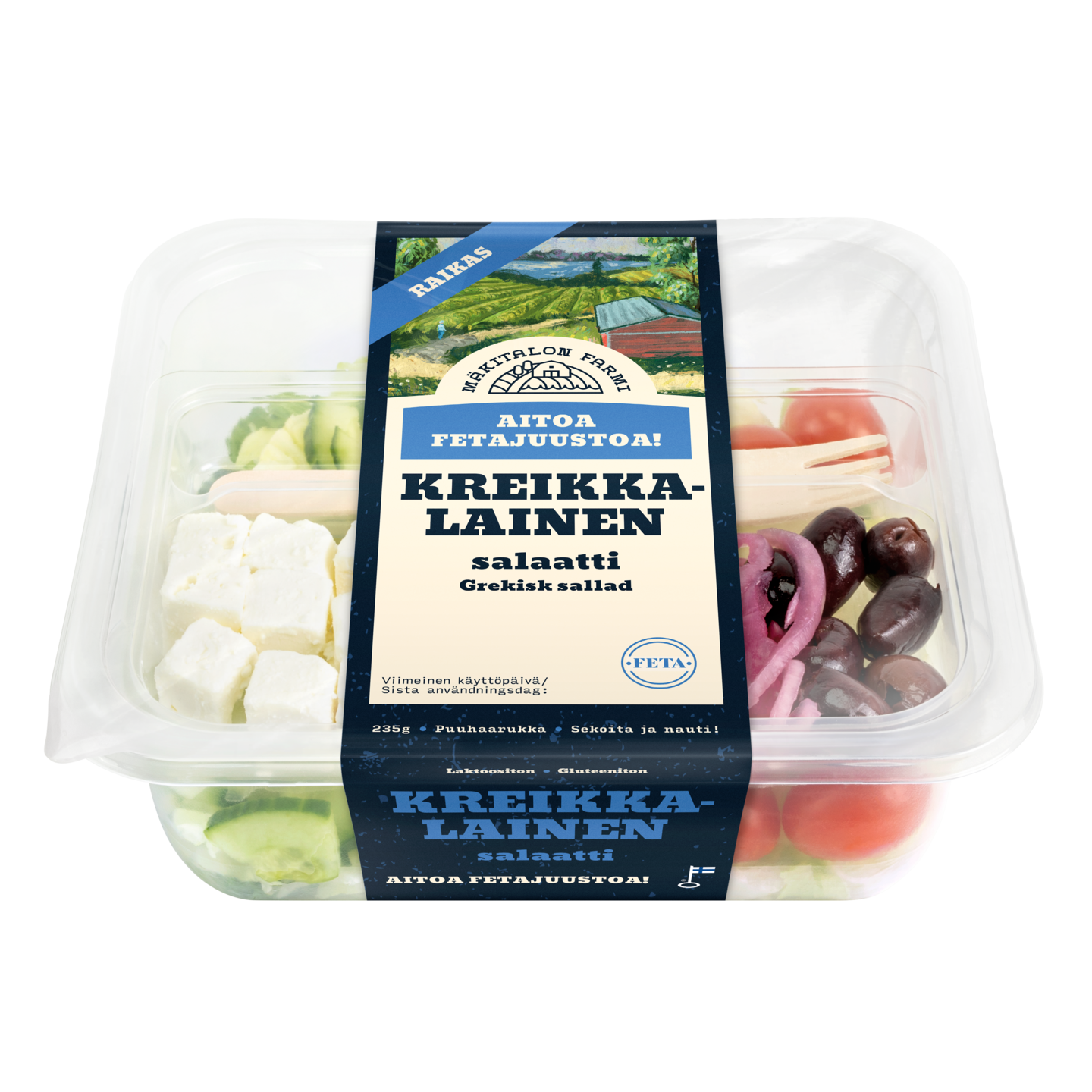 Klassikko välimeren raikkailla tuulahduksilla! Kreikkalaisessa salaatissa on aitoa fetaa, marinoitua punasipulia, tomaattia, kalamata-oliiveja, jäävuori-jääsalaatti-sekoitus sekä vinegretti-kastike.