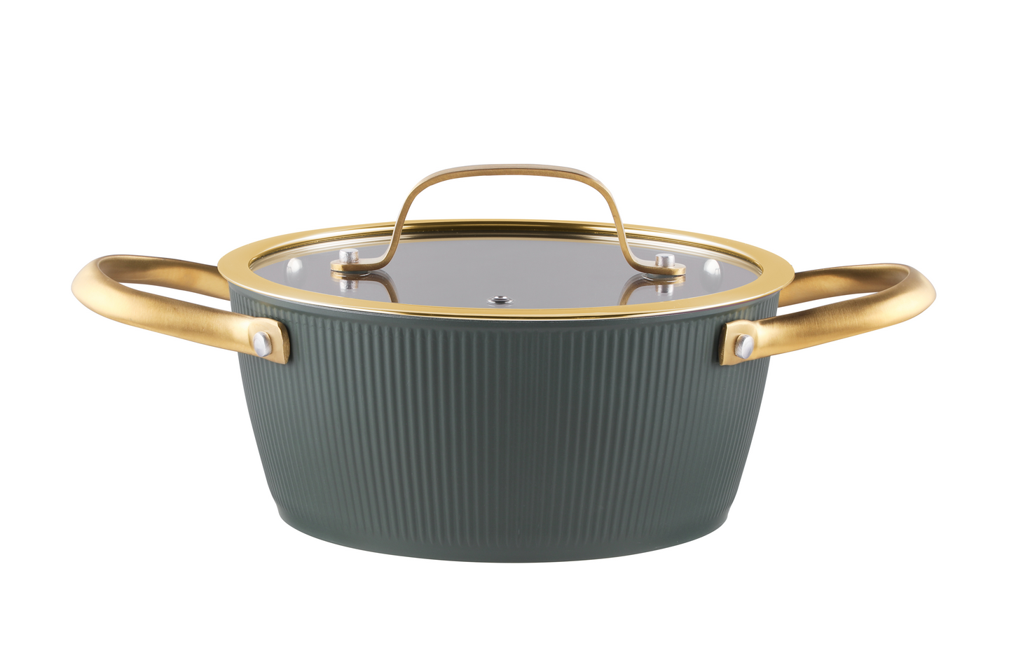 Tummanvihreä kattila kullanvärisillä teräskahvoilla on täydellinen valinta keittiöösi, sillä se yhdistää tyylikkyyden ja käytännöllisyyden. Tukeva runko on valmistettu taotusta alumiinista, mikä takaa erinomaisen lämmönjohtavuuden ja kestävyyden. Keraaminen tarttumaton Greblon-pinnoite tekee ruoanlaitosta vaivatonta ja puhdistuksesta helppoa. Kattilan kullanväriset kahvat lisäävät keittiöön ripauksen ylellisyyttä. Kattilassa on tyylikäs muotoilu ja kaunis uritettu ulkopinta. Lasikansi höyrynpoistoaukolla. Vetoisuus 2,4 L. Kattila sopii kaikille liesityypeille, joten voit käyttää sitä huoletta niin kaasulla, sähköllä kuin induktiollakin. Parhaan kestävyyden takaamiseksi suosittelemme käsinpesua. Materiaali: alumiini, ruostumaton teräs, lasi.